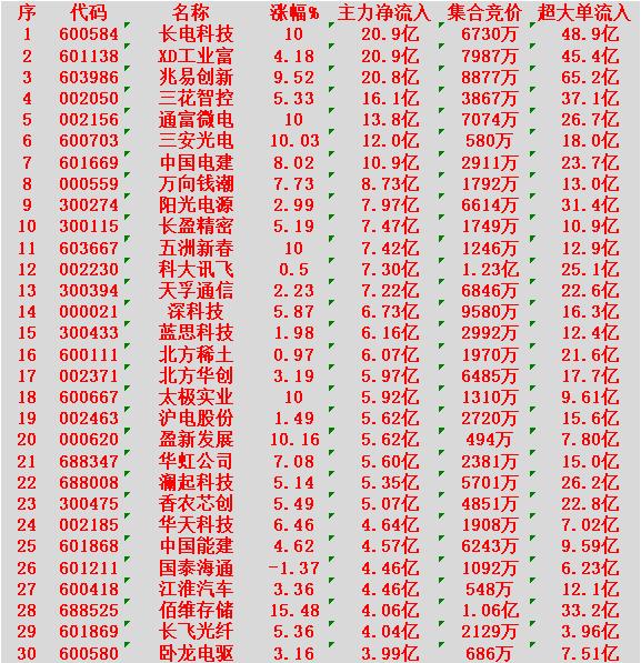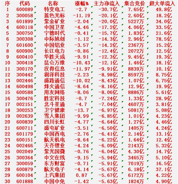 1月16日收盘,主力资金,已经大幅卖出的30名单: 特变电工:净流出 30.7亿元 蓝色光标:净流出 20.1亿元 紫金矿业:净流出 20.0亿元 中国卫星:净流出 17.2亿元 宁德时代:净流出 15.7亿元 中际旭创:净流出 14.3亿元 中国铝业:净流出 14.2亿元 长江电力:净流出 12.4亿元 华胜天成:净流出 12.3亿元 昆仑万维:净流出 12.1亿元 1月16日收盘,主力资金“大幅买入”的100名单: 长电科技:净流入 20.9亿元 XD工业富联:净流入 20.9亿元 兆易创新:净流入 20.8亿元 三花智控:净流入 16.1亿元 通富微电:净流入 13.8亿元 三安光电:净流入 12.0亿元 中国电建:净流入 10.9亿元 万向钱潮:净流入 8.73亿元 阳光电源:净流入 7.97亿元 长盈精密:净流入 7.47亿元 五洲新春:净流入 7.42亿元 科大讯飞:净流入 7.30亿元 天孚通信:净流入 7.22亿元 深科技:净流入 6.73亿元 蓝思科技:净流入 6.16亿元 北方稀土:净流入 6.07亿元 北方华创:净流入 5.97亿元 太极实业:净流入 5.92亿元 沪电股份:净流入 5.62亿元 盈新发展:净流入 5.62亿元