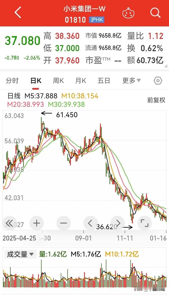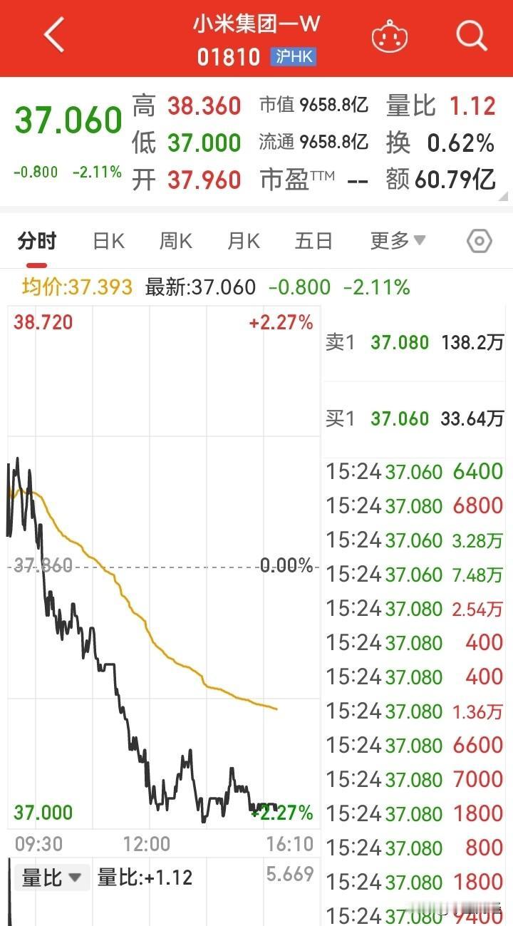 小米集团的股价一开盘就被摁着向下,这是什么节奏?这是否说明了汽车行业激烈的,惨烈的竞争?前期,雷军在40元左右,用真金白银增持,但也被套了!