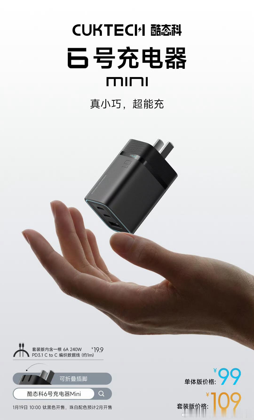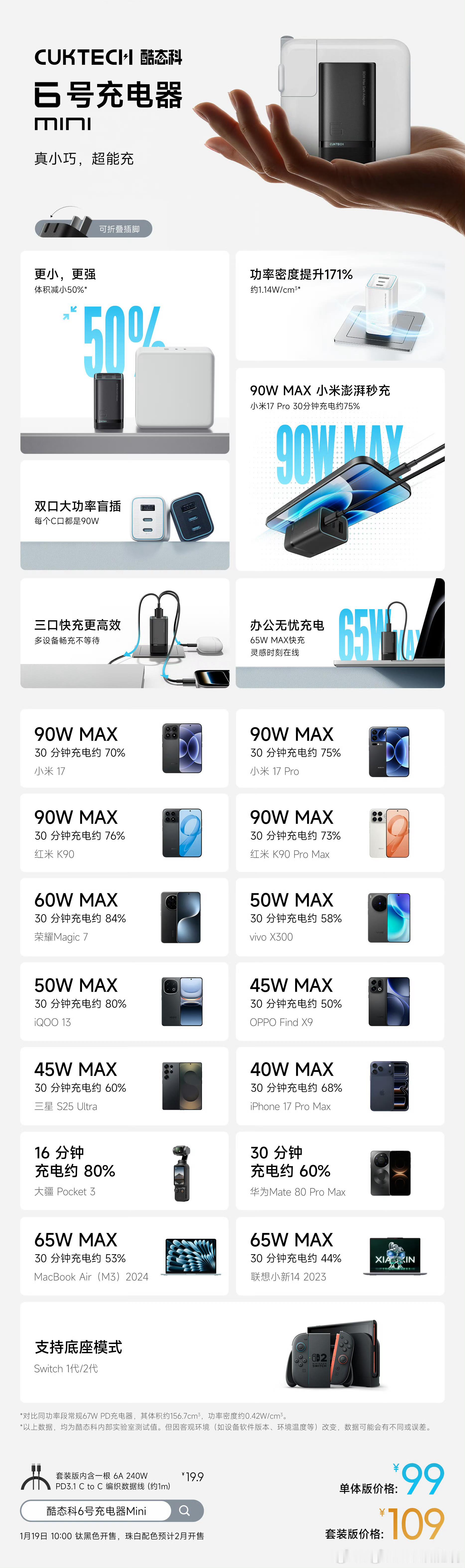 酷态科又一个新品,6号mini。2C1A,支持小米90W,其他的支持65W PD,支持Switch2底座模式,体积看着比10号mini小一圈,单体99,加一根6A线109。