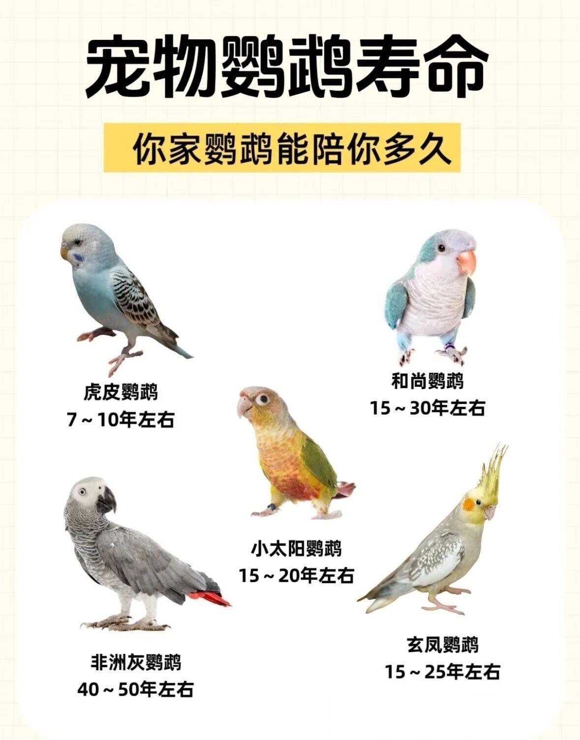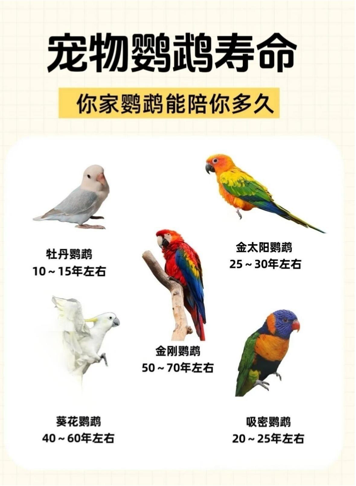 灵动艳丽的鹦鹉是不少家庭的热门宠物,不同品种的陪伴时长差异显著,且多数鹦鹉受法律监管,饲养前需厘清合法性与长期责任。以下结合权威规范,盘点常见家养鹦鹉的圈养寿命,同步梳理合规要点,帮你避开饲养误区。 小型鹦鹉(新手入门优选,无许可即可饲养) 虎皮鹦鹉:圈养寿命7-10年,科学养护可突破10年上限。作为完全合法的入门品种,寿命受饮食与环境影响较大,日常以谷物为主粮搭配新鲜蔬果,寿命普遍稳定在8年左右。 桃脸牡丹鹦鹉:寿命10-15年,是唯一可合法饲养的牡丹鹦鹉品种。其余多数牡丹鹦鹉亚种受保护,购买时需认准品种,避免无意触犯法律,寿命参考宠物鸟类养护权威数据。 玄凤鹦鹉(鸡尾鹦鹉):寿命15-25年,圈养平均寿命约18年。性格温顺易互动,无需特殊许可,保持环境稳定、饮食均衡,寿命可接近上限,数据源自林业部门宠物养护指南。 中型鹦鹉(需佩戴专用标识方可饲养) 和尚鹦鹉(僧侣鹦鹉):寿命15-30年,圈养常见寿命约20年。属国家重点保护动物,需佩戴国家林业主管部门监制的专用标识,仅限个人观赏,不可经营繁殖。 小太阳鹦鹉(绿颊锥尾鹦鹉):寿命15-20年。纳入专用标识管理试点品种,需通过正规渠道购买并获取标识,非法饲养、售卖将承担法律责任,寿命数据来自野生动物救护中心监测。 金太阳鹦鹉:寿命25-30年,长寿个体可达35年。需提前办理相关许可手续,饲养前务必确认审批流程,避免违规,寿命记载于《世界鸟类手册》中型鹦鹉专项研究。 吸蜜鹦鹉(合规标识品种):寿命20-25年。部分亚种纳入标识管理,以花蜜、果实为主要食物,饲养环境湿度需达标,否则易缩短寿命,数据参考鹦鹉人工繁育规范。 大型鹦鹉(严格许可管理,严禁私自饲养) 非洲灰鹦鹉:寿命40-50年,圈养长寿个体可达60年。参照国家一级保护动物管理,未经许可私自饲养属违法行为,野外寿命略短于圈养,数据源自濒危物种保护联盟报告。 葵花鹦鹉:寿命40-60年,圈养平均寿命45年左右。为国家二级保护动物,个人饲养需通过严格审批,寿命数据来自林业部门野生动物繁育监测档案。 金刚鹦鹉:寿命50-70年,部分品种可突破70年。全品类受法律保护,非法交易、饲养将面临刑事处罚,其长寿特性意味着需做好长期陪伴甚至“传承”的准备。 核心饲养提醒:鹦鹉寿命与饮食、环境、互动质量密切相关,均衡膳食与稳定环境能有效延长陪伴时长。目前仅虎皮、桃脸牡丹、玄凤三种鹦鹉可无许可饲养,其余品种需认准专用标识或办理许可。购买时务必通过正规渠道,拒绝非法来源,既守护生态安全,也避免法律风险。