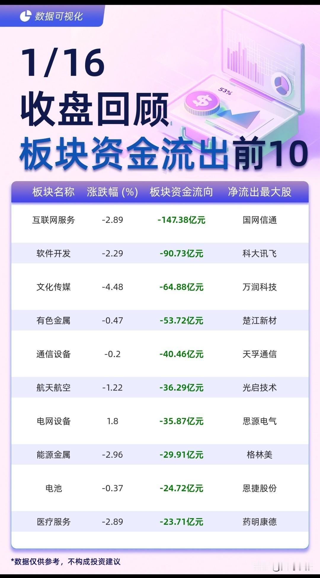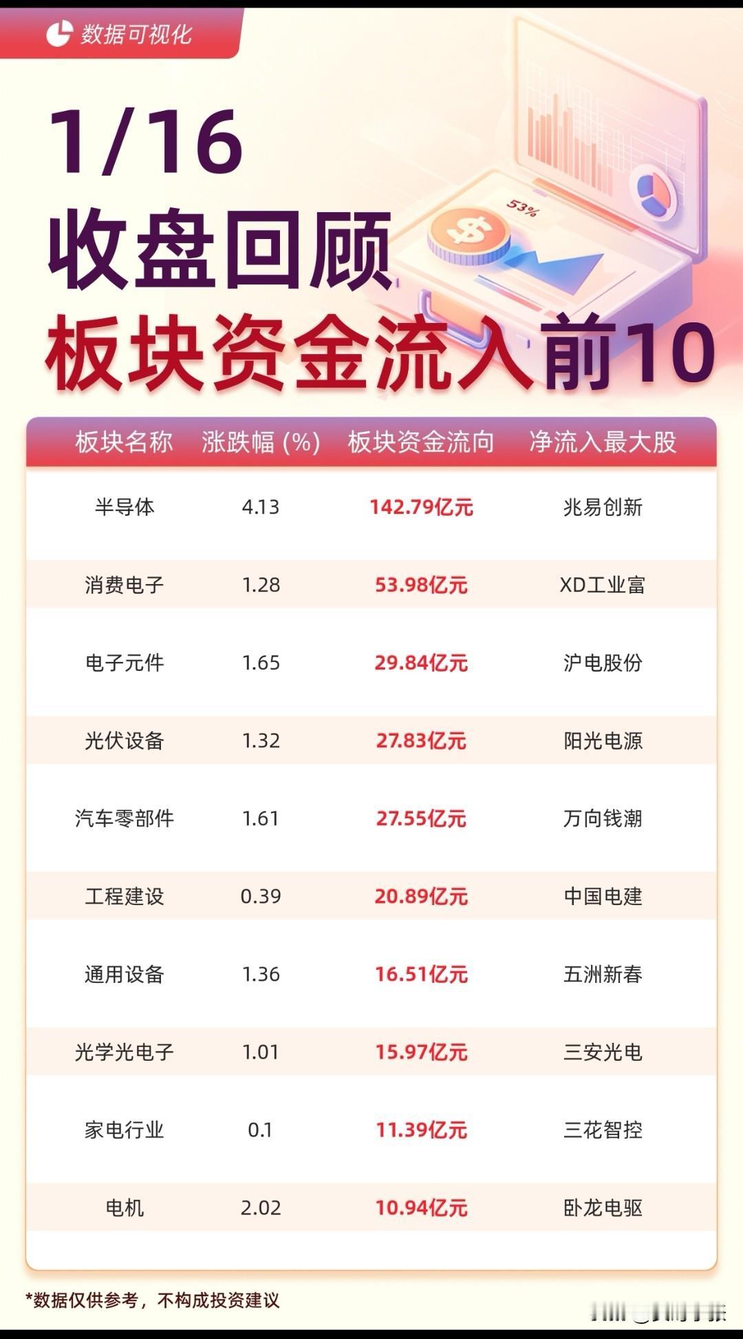 1/16 收盘资金全景图 主力资金动向清晰可见:半导体、消费电子成今日吸金主力,板块与个股双双领涨。 互联网服务、软件开发则遭遇大额资金撤离,部分个股跌幅显著。资金的潮水涌动间,市场强弱格局已悄然浮现。