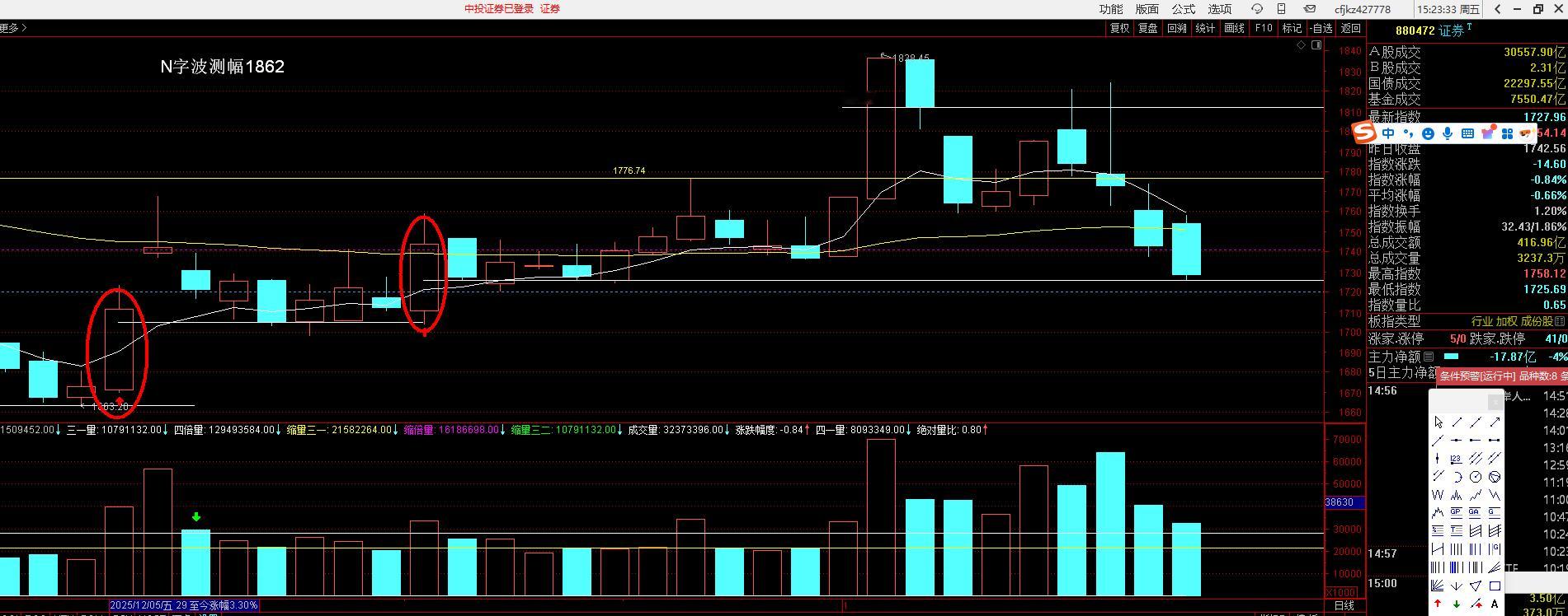 下周一,主要观察市场品种的上线下线设置510210 上证指数ETF 上线1.027、下线1.018IFL8 沪深主连 上线4746、下线4714999999 上证指数 上线4118、下线4083880472 证券 上线1741、下线1720300059 东方财富 上线24.09、下线23.68880493 软件服务 上线3435 、下线3389000016 上证50 上线3099 、下线3066周线收盘,证券跌破了上个周阳的实底,同时周线EXPMA开始往下(图1),这里要预防证券指数的中线波段走弱带弱上证,但是今天全市场涨停数量67个,跌停数量57个,这种情况下,参考左侧前一个波段高点到低点回调6天,这里如果也延续打压2-3天,很容易出现跌停数量超过涨停数量的情绪冰点,若那样走,则反弹随时可能出现,但如果这样走的话,证券容易跟着再打压2-3天,证券指数左侧的王牌金阶目前还有刹车和换挡(图3),如果踩的目标是换挡基柱,则市场还能再蹲1天,如果市场要打劫更深,以刹车基柱为目标,则市场可以再蹲2-3天,不管从哪个角度去看,下周初都保持谨慎,但是也不能死空,预防主力不破二级或者一级出现的反攻,即重新形成依托左侧他平衡再做新的自平衡,最后尤其注意现在证券指数月线左侧大阴二一位1740.53(图4),只要再次重新以飘龙次阳二次站稳1740.53,还是怂翻多。时间往后,慢慢靠近1月下旬,尤其是到了2月,这里只贴近节奏,但不能因为下跌就看空,淡化牛市熊市心态,做结构行情的波段。