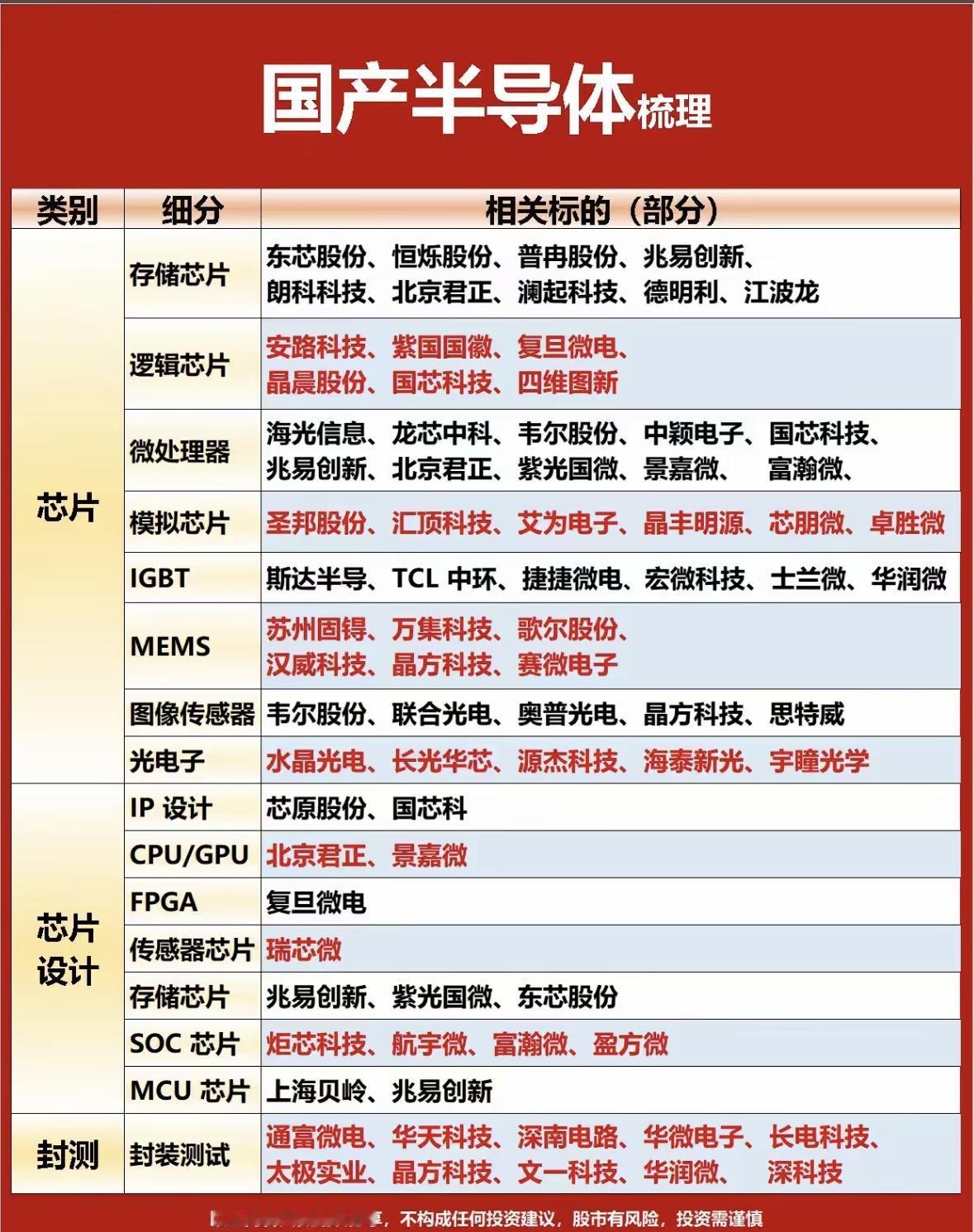 国产半导体行业深度梳理,掌握行业龙头! 国产半导体细分领域及代表企业盘点,涵盖存储、逻辑、模拟等芯片类别,仅供知识分享,投资需谨慎。 国产半导体产业链梳理:存储芯片、逻辑芯片、模拟芯片、传感器等细分领域及代表企业,投资需谨慎。