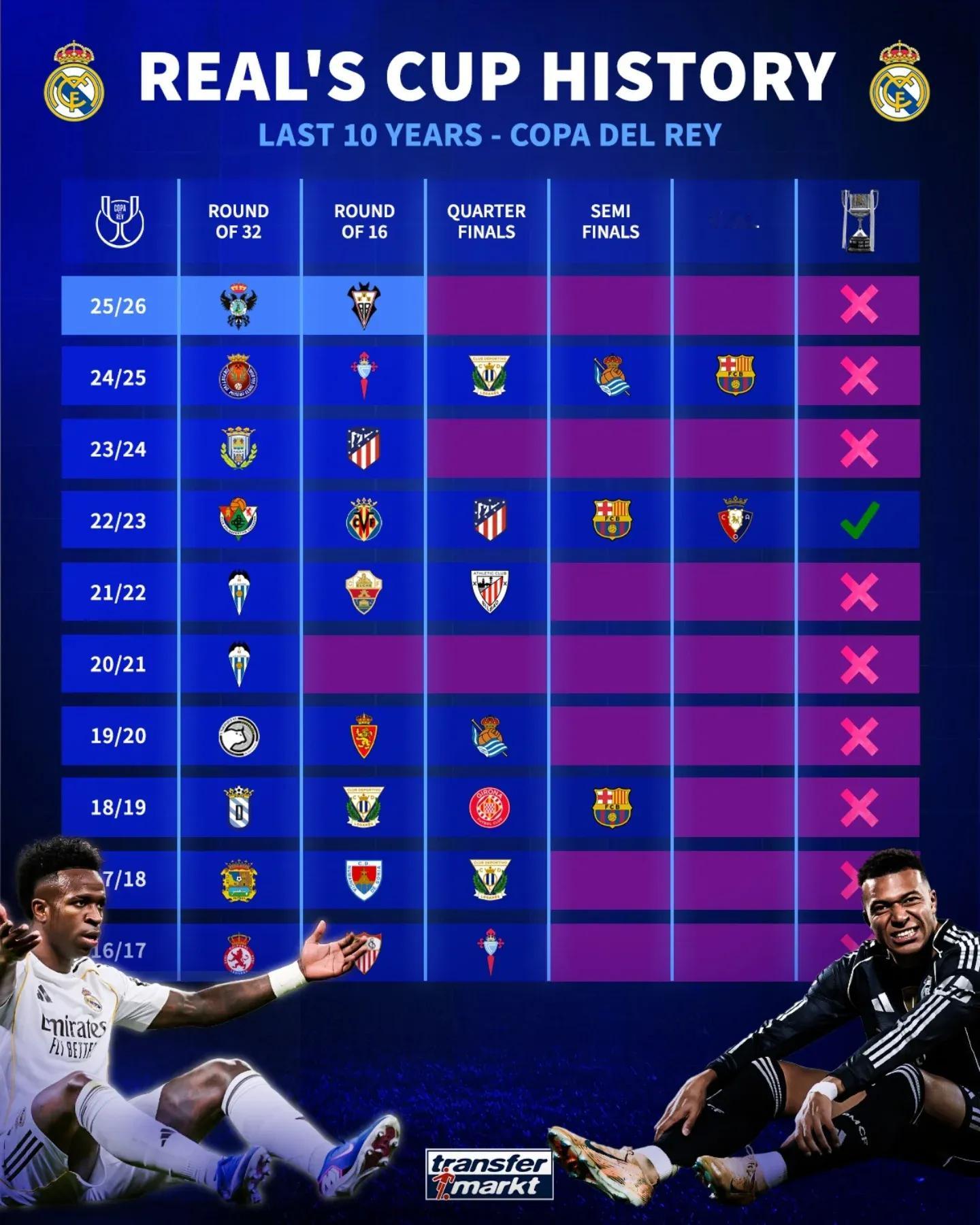 皇马近10年国王杯战绩:仅1次夺冠,2次被低级别球队淘汰