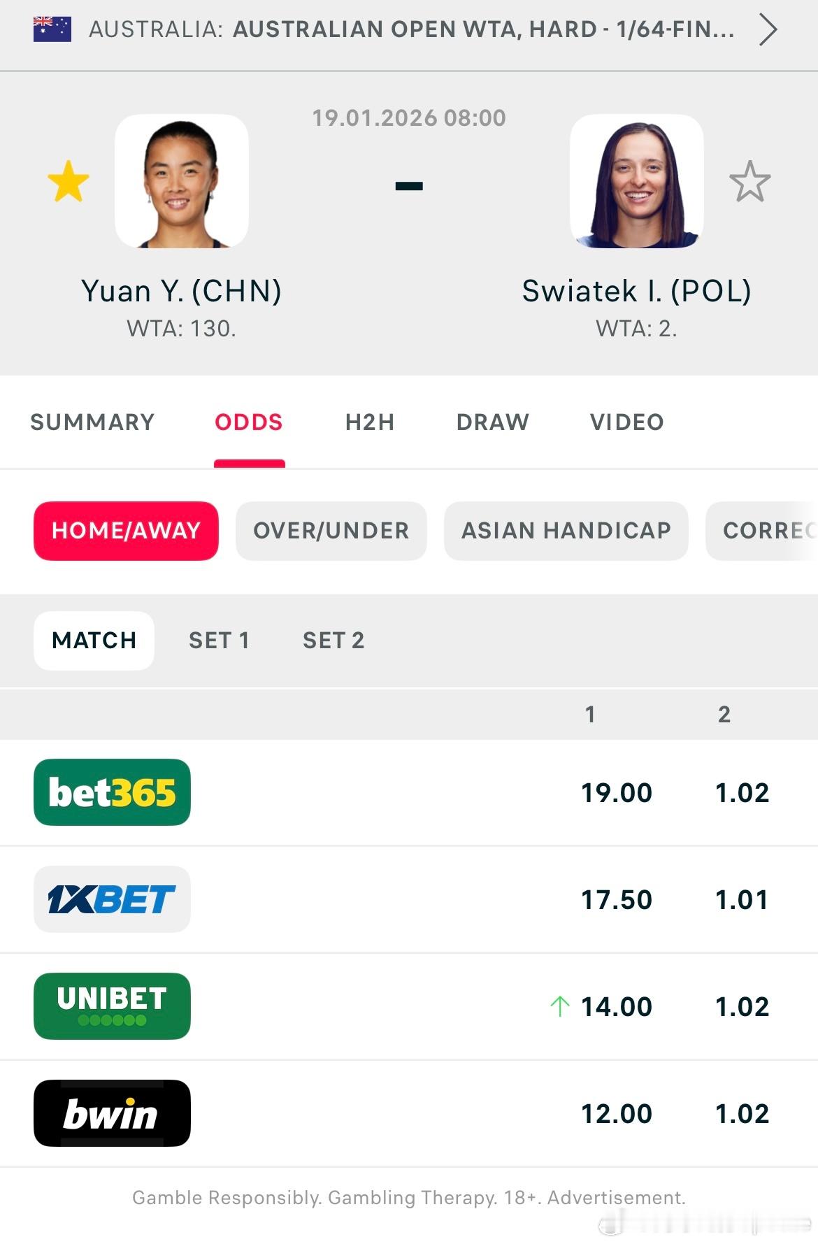 澳网2026 🇨🇳袁悦vs斯瓦泰克🇵🇱19.00-1.02 这个如果要赢是什么概率这很澳网袁悦vs斯瓦泰克