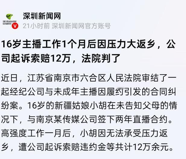 “吃人不吐骨头!”江苏南京,一公司花5000元签下了16岁女孩当主播,为期两年。然而,女孩进入公司后,公司安排的高强度工作让女孩无法承受,便索性趁着假期偷偷跑回了老家。事后,公司以女孩违约为由,将其起诉至法院索赔120000元! 说白了,这根本不是什么明星孵化生意,就是某些公司用5000块定金圈住未成年人的“合法抢劫”戏码,套路深到能把人骨头都榨干。 南京这起案子里的16岁新疆小姑娘,就是栽进了这种精心布下的陷阱里,以为能圆个轻松赚钱的主播梦,到头来差点被天价索赔压垮。 其实这类公司的操作手法都如出一辙,先打着“免费培养明星”的旗号,在全网撒网签约,他们目标能达到十万个学生妹,而且签的从来不是保障权益的劳动合同、劳务合同,而是权责不对等的经纪合同,这一字之差,就把所有风险都转嫁给了年轻人。 等你签完字,高强度的工作就会铺天盖地而来,我感觉一天直播十个小时都是常态,有的合同里还明确要求每月直播不少于26天,每天至少6小时,连短视频录制都有硬性指标。 熬完疲惫的一天,等结算收入时才发现,辛辛苦苦赚的钱别说攒下来,可能连公司扣的所谓房租、服装费都不够,曾经还有个被主播公司坑的小妹妹,差一点就饿死了,可见这种压榨有多离谱。 等你扛不住想解约,公司就会立马甩出合同,违约金动辄20万起,再叠加各种莫须有的培训费、流量费,瞬间把你逼入绝境。 大多数年轻人没见过这阵仗,又不懂法,只能选择协商,一般赔个3-5万了事。 就算有人硬气不肯赔,公司起诉到法院,最后往往也能拿到这个数,毕竟普通人耗不起时间和精力。 更离谱的是收益和风险的失衡,就拿这个女孩来说,这家公司能给她的薪水撑死一个月一万,可一旦她受不了违约,合同里动辄就是几百万的违约金,这种不对等的条款,纯粹是明晃晃的欺负人。 这类公司的做派,根本不像现代企业,反倒像停留在封建社会甚至奴隶社会的剥削者。 他们就像网上那些卖货的,吹得天花乱坠的样品和实际拿到手的东西天差地别,把坑蒙拐骗的人性丑陋展现得淋漓尽致。 为了利益简直疯狂至极,眼里只有钱,毫无底线可言,就像一位哲学老师说的,自私自利,一盘散沙。 好在这个女孩是未成年人,属于限制民事行为能力人,法院认定合同无效,最终只让她返还几千块差额和500元赔偿,算是侥幸逃过一劫。 以上仅为个人看法,不是对事件的评价,面对这类看似光鲜的工作机会,年轻人该如何规避陷阱?你身边有没有遇到过类似的合同套路?欢迎在评论区聊聊你的看法。