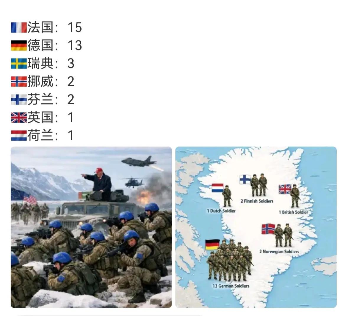 捷报,捷报,丹麦的格陵兰岛有救了。欧洲列强出兵支持格陵兰岛,美国不敢动了!曾经号称全球日不落帝国的英国出兵一人! 所以英国始终是美国的跟屁虫,是美国的小弟,出兵一人,这是名义上支持丹麦。 大家来看一下欧洲列强支持丹麦出兵的数量,其中:法国15人、德国13人、瑞典3人、挪威2人、芬兰2人、英国1人、荷兰1人,合计37人,相当于一个排的兵力,还不如我们顺德一个镇城管的队伍人数! 很难想象,这些所谓的欧盟、北约成员国内部团结到什么地步,这就是他们所谓的团结一致! 朝鲜出兵支持俄罗斯是真正的兵强马壮成建制的规模过去,最起码一个重装旅! 回想一下,二战的时候,德国为什么闪电战可以让欧洲很多小国几个小时就投降,确实现在也可以理解! 欧盟、北约这样会土崩瓦解,名存实亡! (图片来源于网络,如有侵权,请联系删除)