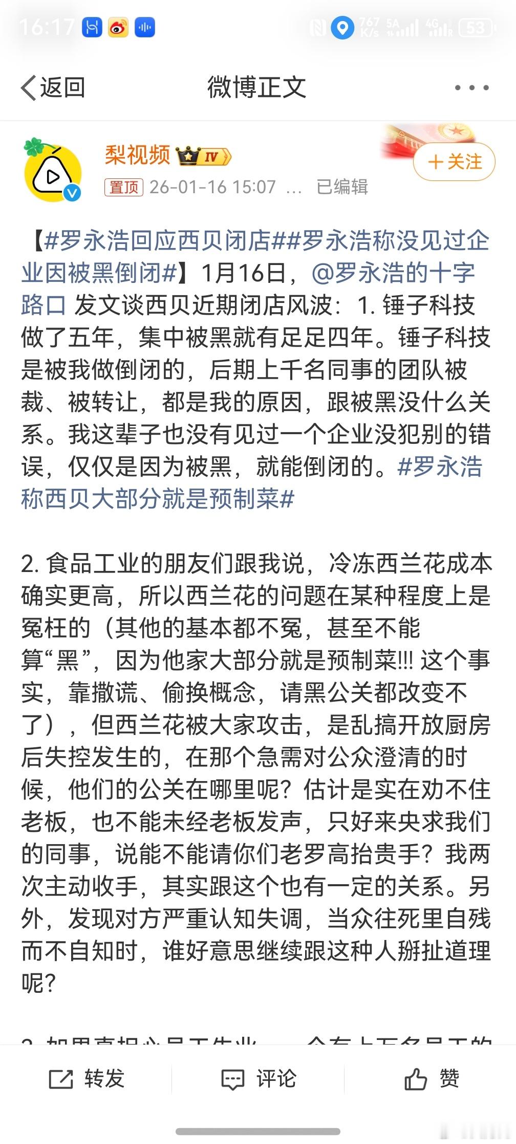罗永浩回应西贝闭店 ,其实这事儿吧,罗永浩只是个引子,最重要的是贾老板的各种骚操作,才让大家真的是无法理解。