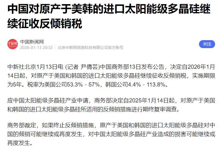 美国懵了! 关税刚落地,中国的反制就来了! 2026年1月12号,美国那边高调宣布,凡是跟伊朗做生意的国家,跟美国做买卖的时候都要被加征25%的关税,这话里话外的威慑意味藏都藏不住。 可谁也没想到,才过了一天,1月13号中国商务部就直接发了公告,决定对原产于美国和韩国的进口太阳能级多晶硅征收反倾销税,最高能到113%,而且一执行就是五年。 可能有人会说,这是不是就是简单的“美国做初一,中国做十五”? 表面看是一报还一报,但往深了想,这根本不是随便的报复,而是咱们国家在贸易博弈里的清晰表态,每一步都踩得又准又稳。 要知道美国这次加征关税的算盘打得精,想通过这种手段施压那些和伊朗有经贸往来的国家,本质上还是想靠霸权主义左右全球贸易格局。 可他们忘了,中国从来不是任人拿捏的软柿子,你敢随便出手,我就有能力立刻回应,而且回应的力度和针对性,直接戳中要害。 为啥选太阳能级多晶硅这个领域出手?这里面全是门道。现在全球都在搞能源转型,光伏产业是重中之重,而多晶硅就是光伏产业链最上游的核心原材料,相当于光伏产业的“粮食”。 咱们中国在多晶硅领域早就占据了主导地位,全球八成以上的产能都在咱们这儿,美国和韩国的多晶硅产业本来就依赖出口,尤其是对中国市场的依赖度不低。 美国想在贸易上给咱们施压,咱们就精准瞄准他们有依赖、有软肋的领域出手,这一下就把主动权握在了自己手里。 而且这113%的反倾销税也不是凭空定的,早从2014年开始,咱们就针对美国和韩国进口的多晶硅实施反倾销措施了。 后来经过几次复审,发现如果取消这些措施,他们的倾销行为很可能会卷土重来,还会损害咱们国内的多晶硅产业。 所以这次商务部的决定,是基于充分调查的合法合理举措,既维护了国内产业的公平竞争环境,也符合国际规则,根本不是美国说的那种“不正当报复”。 这波反制的速度之快,背后是咱们国家应对外部压力的成熟和底气。以前美国总觉得自己能靠关税大棒想打谁就打谁,觉得其他国家要么反应不过来,要么不敢反抗。 可这次中国用“反制不过夜”的实际行动告诉他们,咱们早就做好了充分准备,不管是政策储备还是产业底气,都能从容应对任何贸易挑衅。 你上午宣布加税,我第二天就出台反制措施,这种效率不是临时抱佛脚能做到的,是多年来产业布局和政策规划的必然结果。 更重要的是,这波操作也给全世界传递了一个明确信号:中国从不主动挑起贸易摩擦,但也绝不惧怕任何贸易挑衅。 咱们始终坚持公平合理的贸易规则,可要是有人想打破这个规则,用霸权手段施压,那咱们必然会坚决反击,而且会精准打击、绝不手软。 美国以为靠加征关税就能逼咱们让步,殊不知这种做法只会搬起石头砸自己的脚。 他们的多晶硅企业失去中国市场,损失可不是一星半点,而咱们国内的多晶硅产业,反而能在公平的环境里更好地发展。 说到底,“反制不过夜”的中国速度,既是应对挑衅的坚决态度,也是国家实力的直接体现。 现在的中国,早就不是以前那种只能被动应对的状态了,在全球贸易格局里,咱们有能力维护自己的合法权益,有底气对抗任何霸权行径。 这波操作也让那些想跟着美国起哄施压的国家看清形势,不要低估中国维护自身利益的决心和能力。 未来不管遇到什么样的贸易挑战,相信咱们都能保持这份从容和高效,用中国速度和中国底气,守护好国家的产业安全和贸易利益。