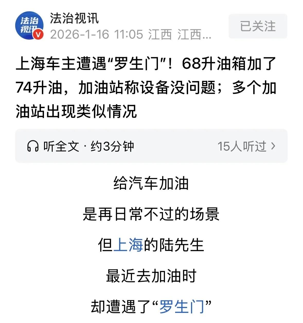 “68升油箱加出73.5升油!”上海车主陆先生的遭遇,直接刷新了大家的认知,这油难不成是凭空变出来的? 陆先生开的是一辆SUV,汽车厂家明确标注油箱安全容积是68升。前段时间他去加油站加油,当时油表灯都没亮,仪表盘显示还能跑150公里,按油耗估算,油箱里至少剩15到20升油。可加完油一看加油机,居然显示加了73.5升! 这账一算,陆先生当场傻眼了。油箱里本来就有十几升油,再加上这73.5升,总油量直奔88升去了,这比油箱的标称容积足足多了20升,就算把油箱当气球吹,也不可能装下这么多油啊! 更让陆先生起疑的是,他后来发现,同一个小区的邻居,居然也在这家加油站遇到了一模一样的事,加油量远超车辆油箱的标定容积。陆先生没忍气吞声,直接找媒体曝光了这事。记者一查近一两个月的12345热线记录,发现多个区的这家加油站,都有车主反映“油箱被加爆”的情况,可这些投诉大多都是加油站给个解释,车主不接受,最后就不了了之。 面对陆先生的质疑,加油站工作人员态度坚决,一口咬定设备没问题,还暗示可能是车辆的实际油箱容量比标称的大。这话听着耳熟,去年8月四川就有位车主在这家加油站遇到类似情况,标称50升的油箱被加了近68升油,多收200块,后来监管部门查实是加油机软硬件故障,导致同一升油算了两遍钱。可这回上海这家加油站的工作人员拍着胸脯说,自查过了,不是这个毛病。 为了弄清真相,陆先生专门联系了汽车厂家,客服回复得很干脆:这款车油箱安全容积就是68升,极端情况下最多也只能多装10%-15%,顶破天总容量也就78.2升,根本到不了88升。 事情闹大后,当地市场监管部门很快介入。执法人员到现场检查加油机,初步给出说法:设备铅封完好,没有被篡改的痕迹,而且在强制检定有效期内,误差符合标准。但光看外表不够,目前已经委托第三方计量质量检测站做专业检测,同时也会联系汽车厂家核实油箱真实容量,两边对证后才能下最终结论。 其实从法律角度来说,这事一点都不复杂。根据《计量法》规定,加油站必须保证加油机的计量准确度,不能损害消费者利益。哪怕加油机有检定合格证,出现这种明显违背物理常识的超量,也不能一句“设备没问题”就搪塞过去。加油机的最大允许误差只有±0.3%,5.5升的误差早就远超法定范围了。 如果后续第三方检测证实是加油机的问题,按照《消费者权益保护法》,陆先生不仅能要求退还多收的油费,还能主张退一赔三,加油站还可能面临高额行政处罚。 现在陆先生和一众有同样遭遇的车主,还在等着一个明确的说法。这多出来的油到底是怎么回事?是机器故障,还是另有猫腻? 大家在加油时遇到过类似的糟心事吗?遇到这种情况你会怎么维权?欢迎在评论区留言讨论!