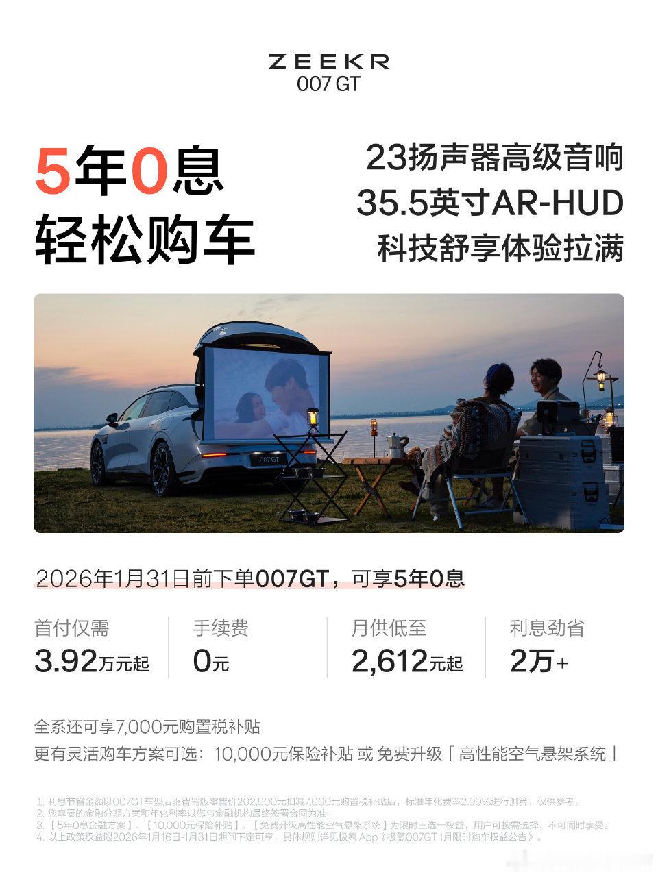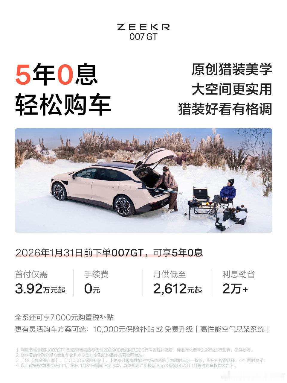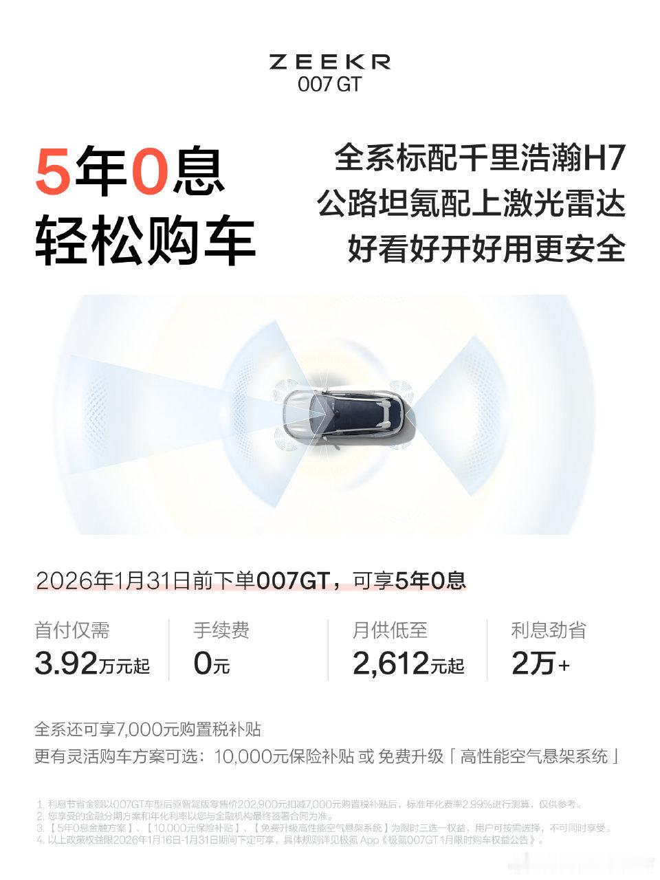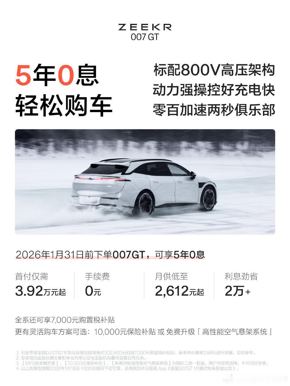 极氪官宣007和007GT更新计划2026年第二季度焕新车型即将上市并将推出搭载新一代 NVIDIA DRIVE Thor-U辅助驾驶芯片及900V高压架构的版本而目前在售的极氪007和极氪007GT也推出了5年0息的金融方案首付3.92万元起,月供2612元起大v聊车极氪007极氪007gt