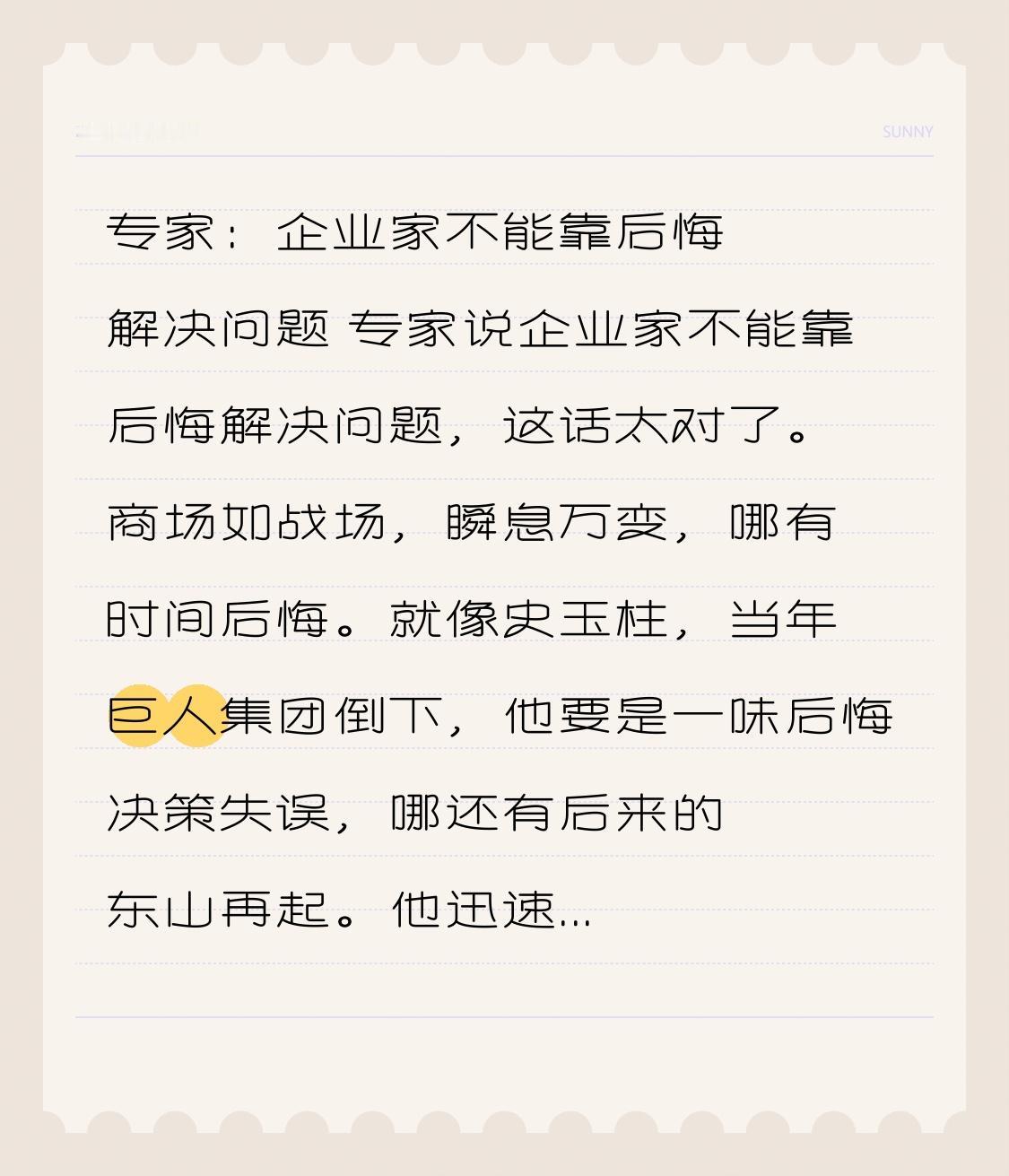 专家:企业家不能靠后悔解决问题 专家说企业家不能靠后悔解决问题,这话太对了。商场如战场,瞬息万变,哪有时间后悔。就像史玉柱,当年巨人集团倒下,他要是一味后悔决策失误,哪还有后来的东山再起。他迅速调整,投身脑白金等项目,重新在商界站稳脚跟。企业家面临的竞争和挑战多如牛毛,一着不慎可能满盘皆输,但后悔没用,得赶紧分析问题,找出解决办法。就像下棋,落子无悔,只能想下一步怎么赢。所以企业家得有往前看、积极应对的劲头,才能在商海乘风破浪。