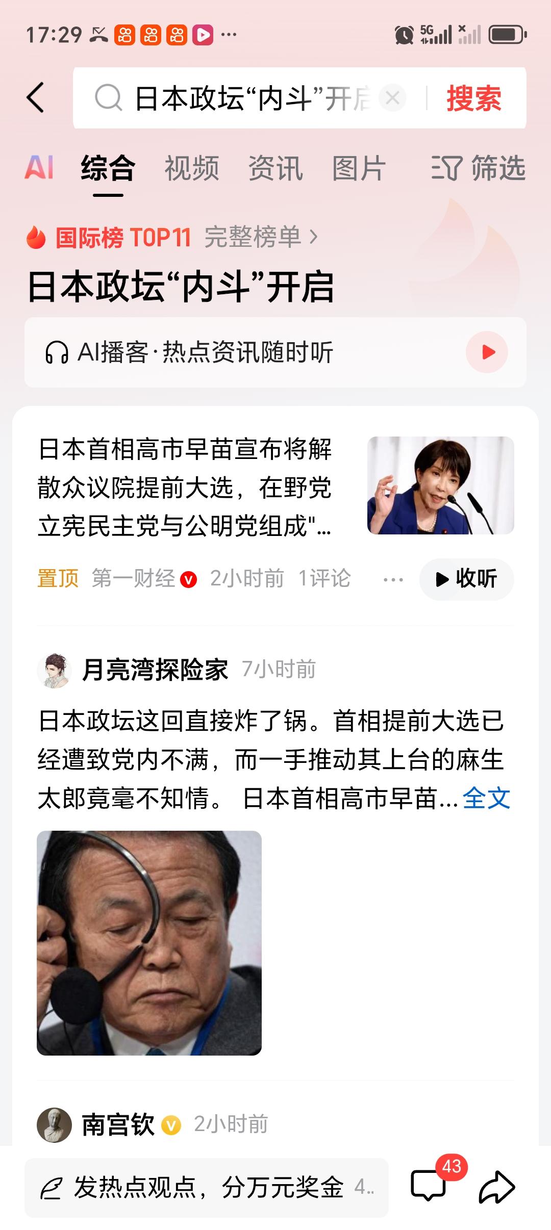 日本政坛“内斗”开启 日本政坛又开始“内斗”大戏了。首相高市早苗执意提前进行众议院选举,距上次选举才过去1年4个月左右。这操作引得在野党纷纷指责她将党派利益置于民众利益之上。 在高市传达解散众议院意向后,日本最大在野党立宪民主党和公明党迅速联手,1月16日就提交联合组党申报,成立“中道改革联合”,组成“反高市联盟”,目标是争取中间选民支持。立宪民主党中间偏左,公明党曾与自民党执政,不同政治光谱的两党走到一起,这场选举看来会很有看头,不知道最后谁能胜出。