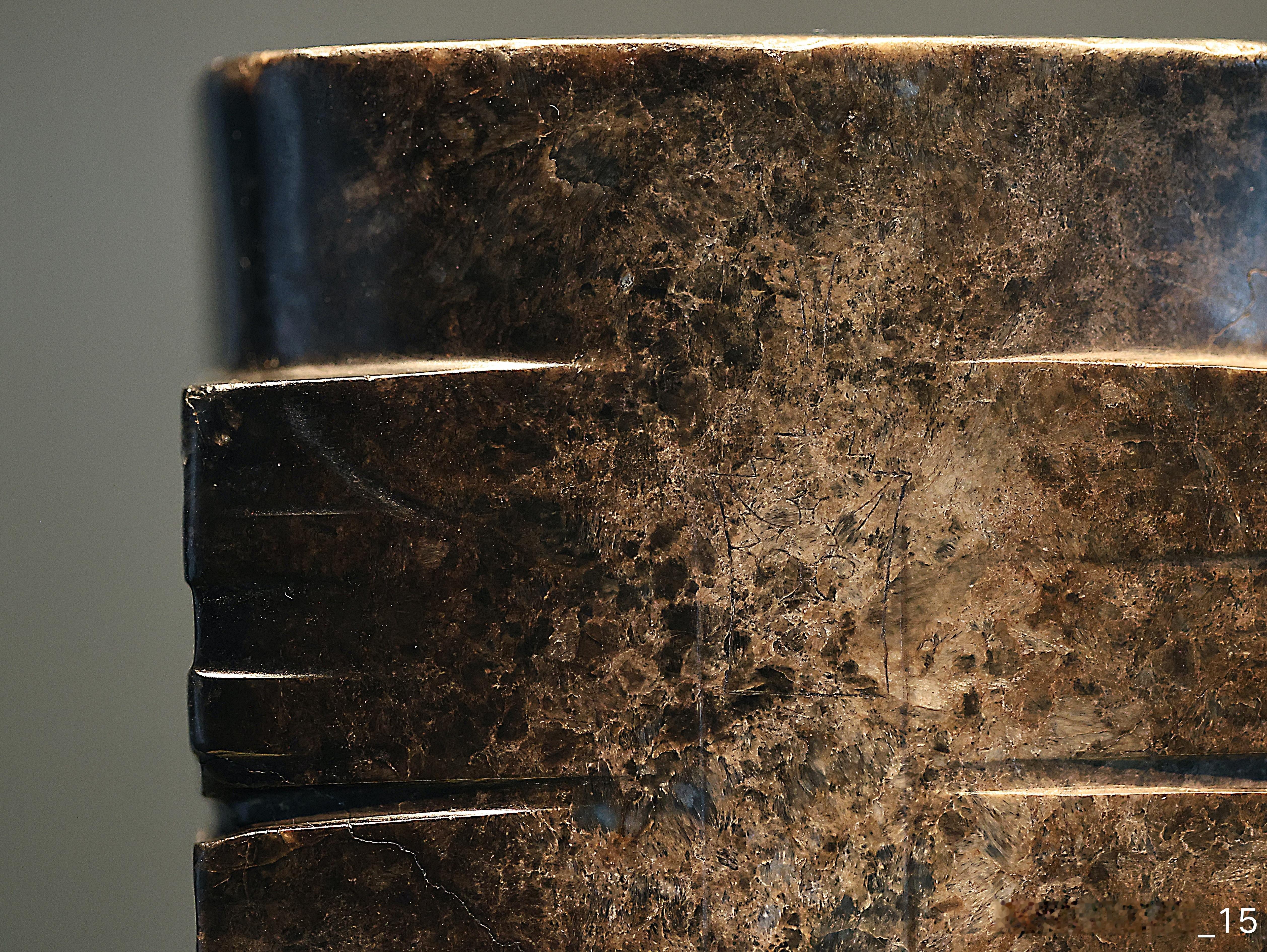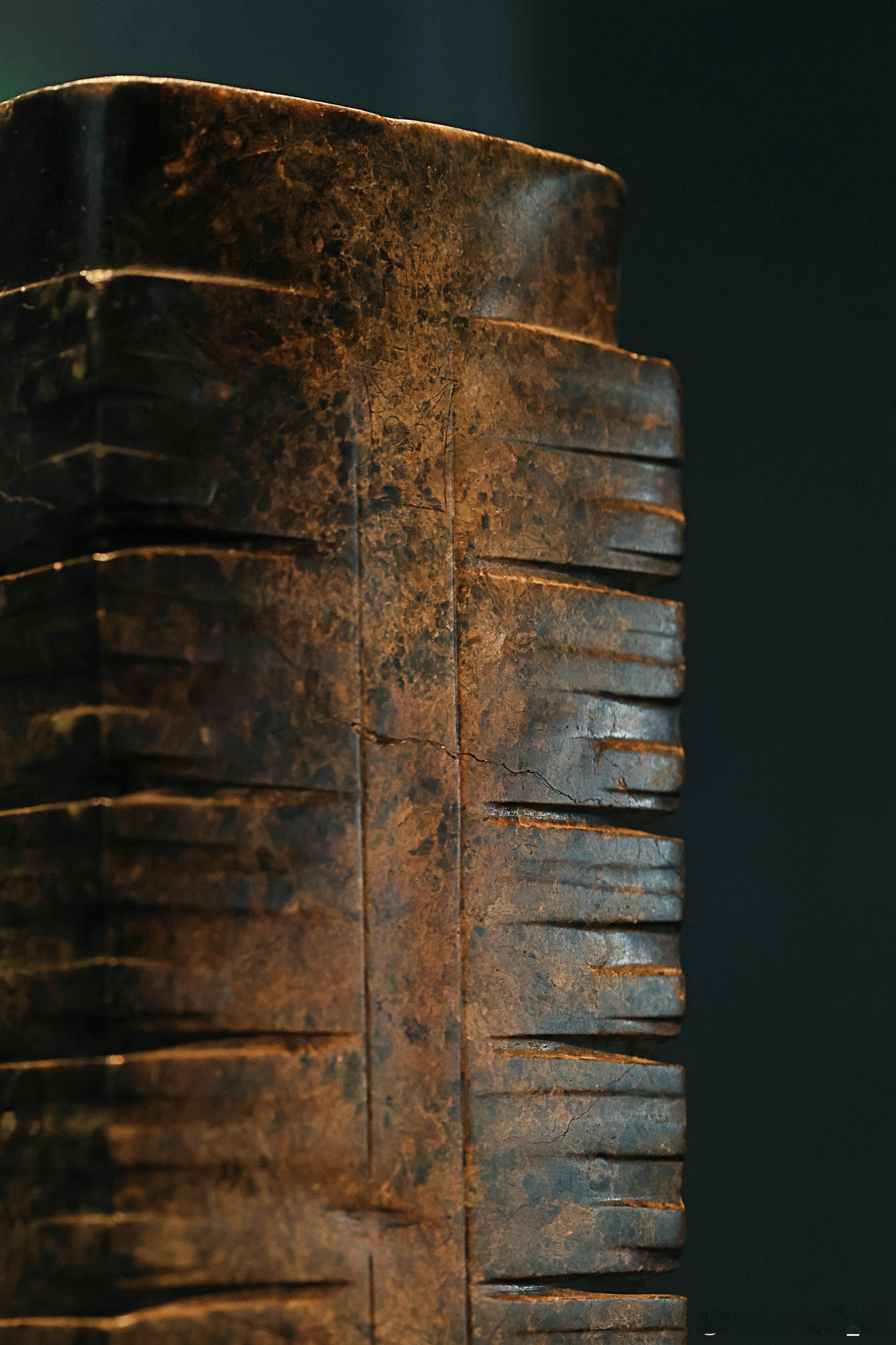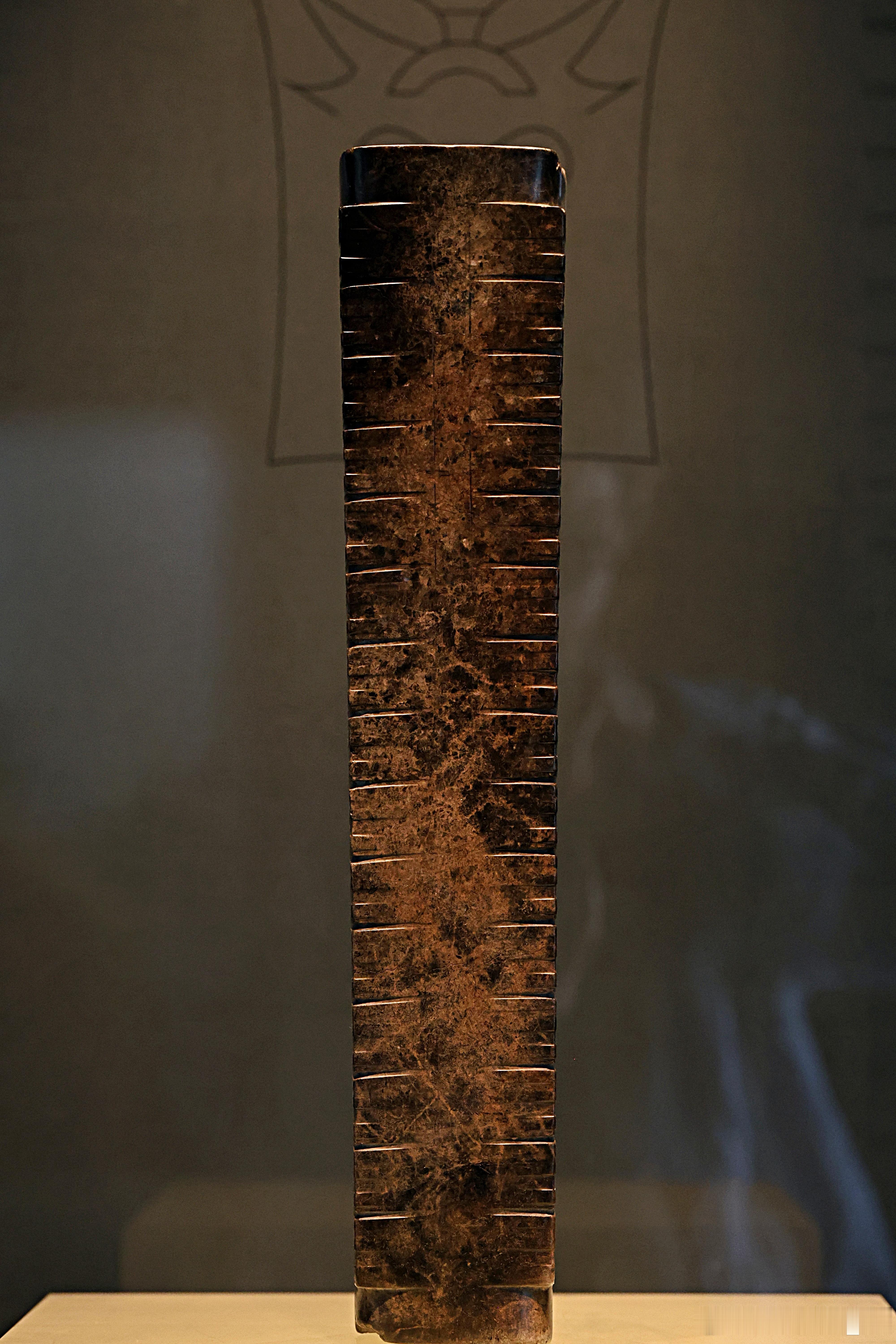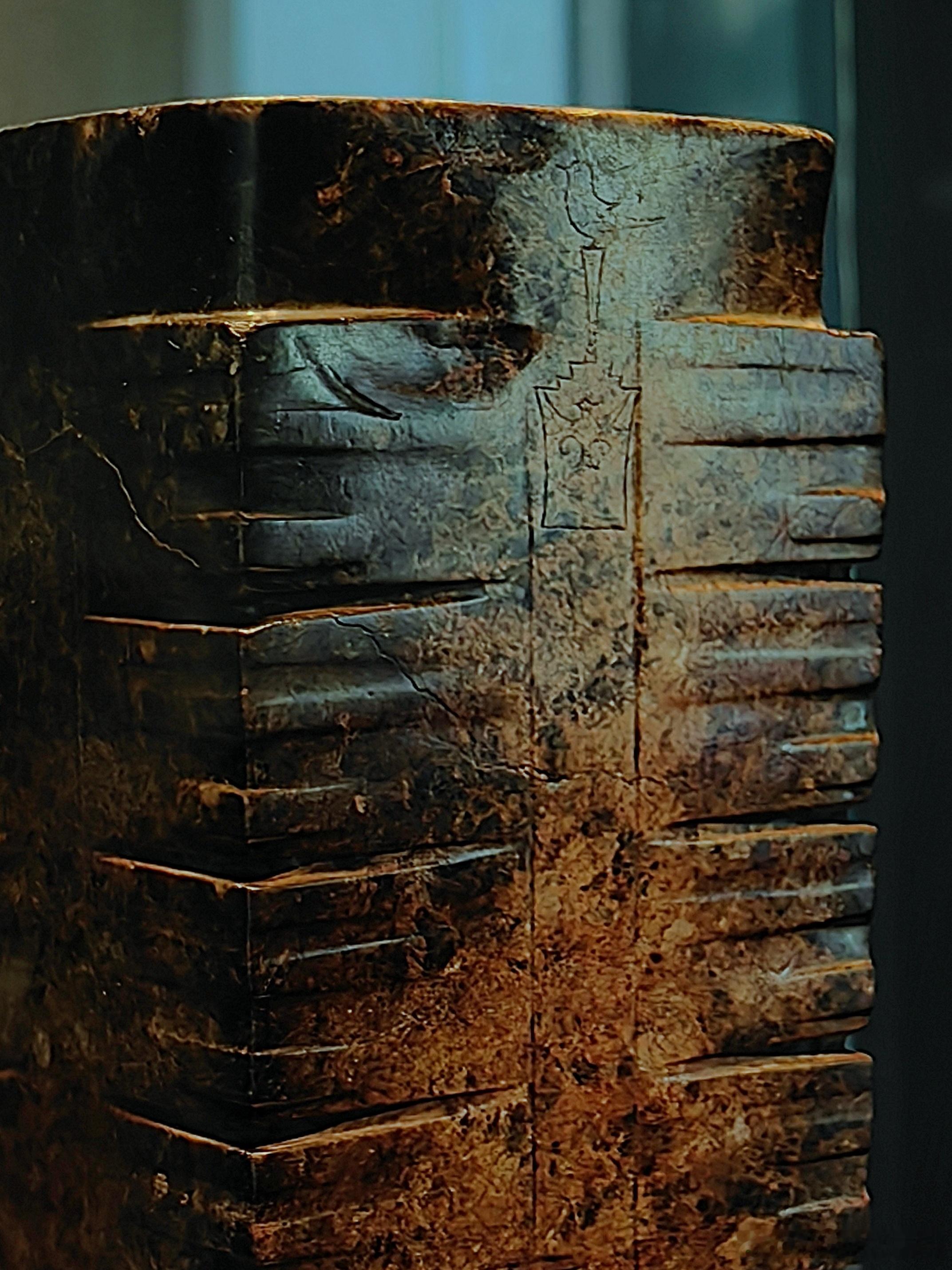 玉兽面鸟纹琮新石器时代良渚文化晚期 首都博物馆藏这件玉琮高38.2厘米。形状呈外方内圆高柱体,两端对钻孔,孔径仅0.8厘米。器身共有十五节,每节两凸一凹,与相邻的面组成一兽面,每个平面都琢有圈形眼。直槽最上方有纤细如毫发的单阴线刻出的鸟纹。玉琮起源于新石器时期,以良渚文化的玉琮最发达,主要作为礼器使用。内圆外方的造型,似印证“璧圆象天,琮方象地”的道理,象征着古人的宇宙观。常见的玉琮纹路有简单的切割纹、简化的变形兽纹、神人纹或神徽纹等。这件玉琮在上部中间近琮口的位置有纤细单阴线刻出的纹路,一只鸟立于高台的立柱之上。