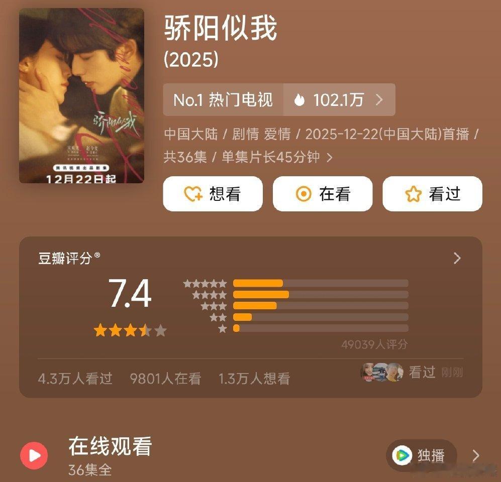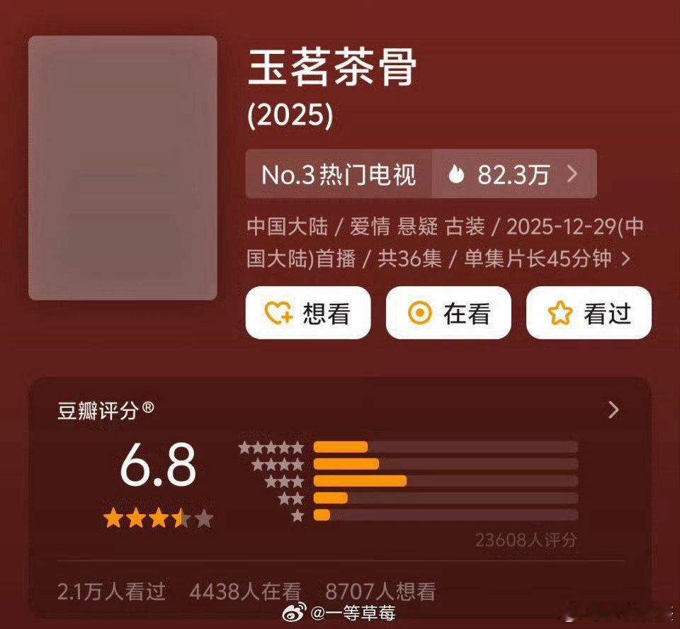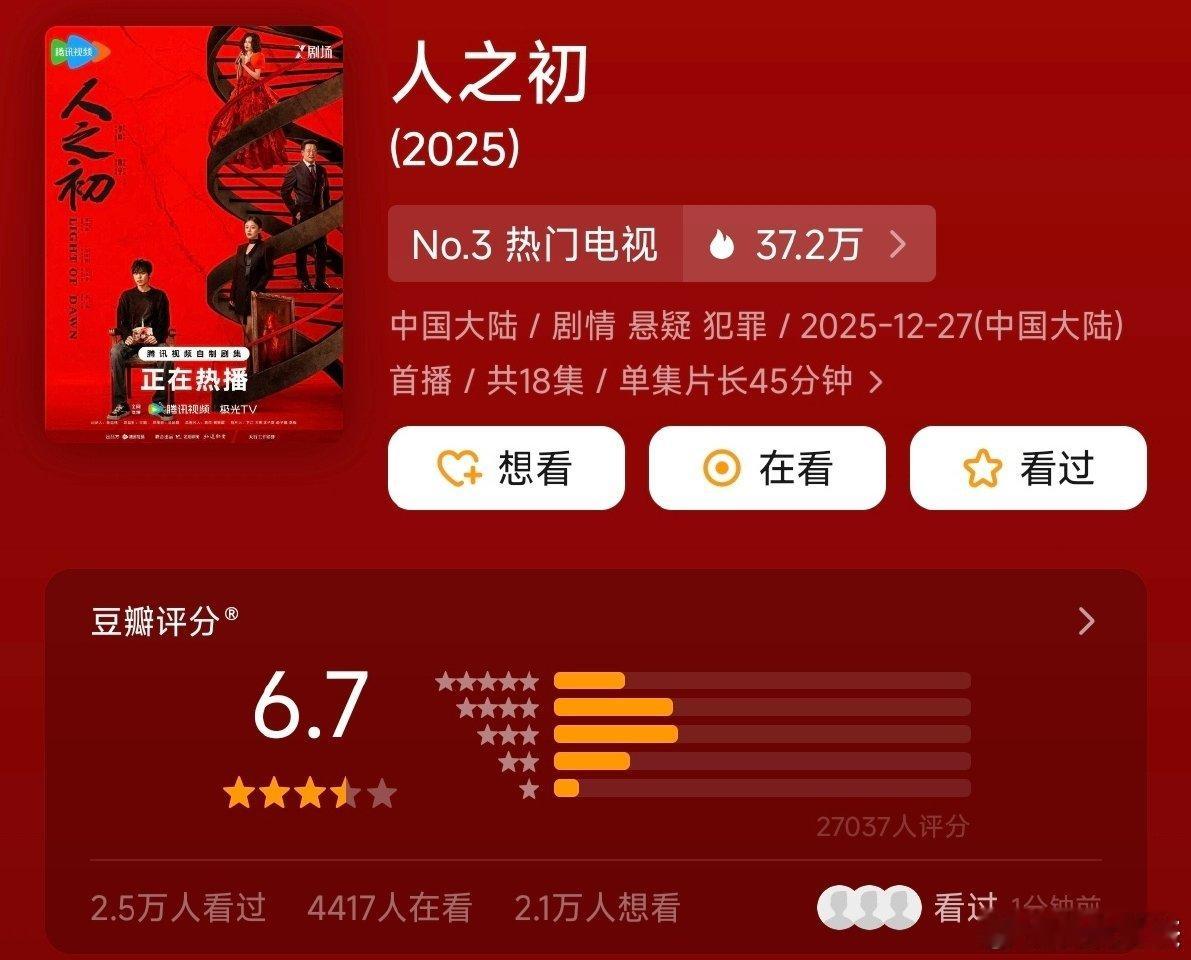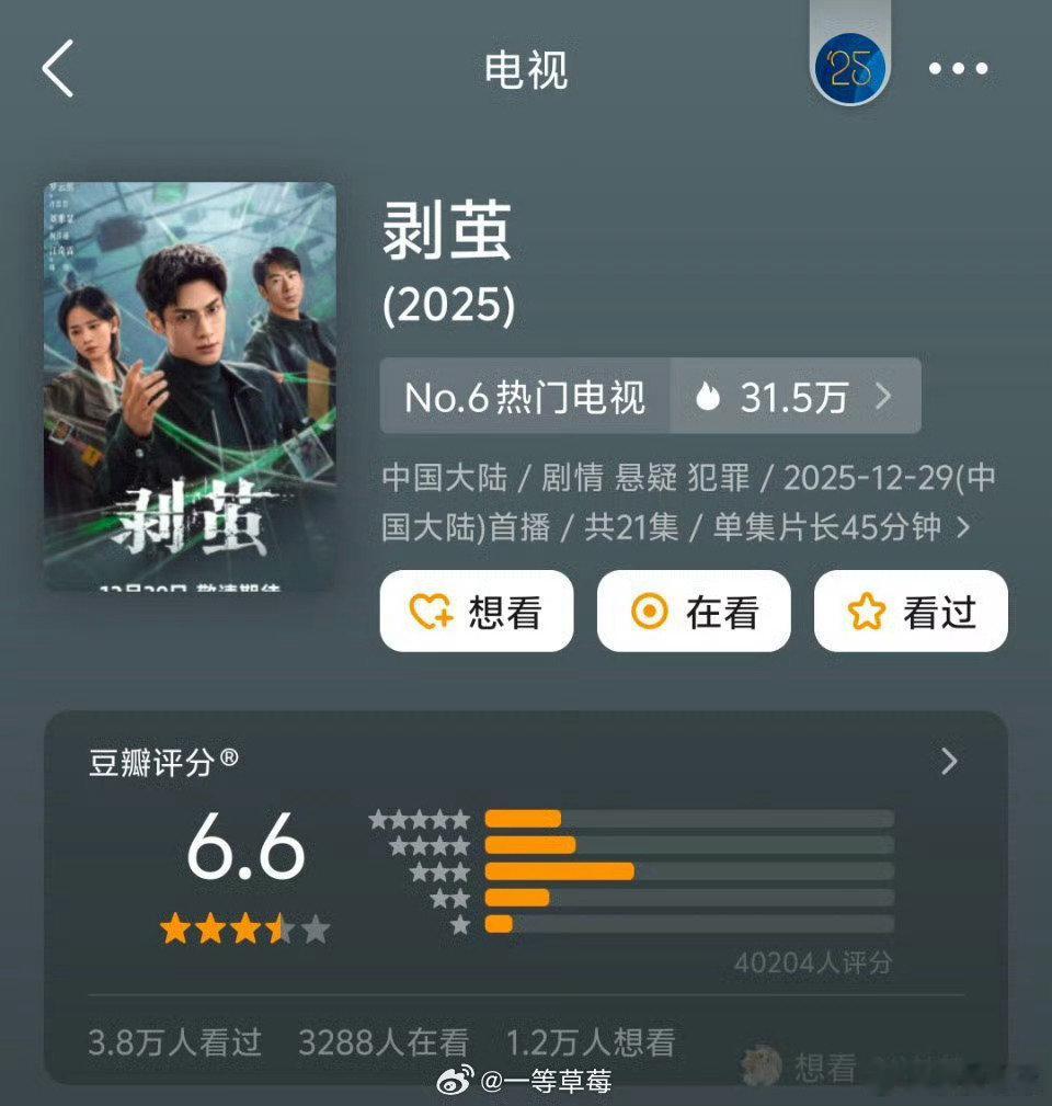 月底剧集豆瓣第一次开分12.22🐧《骄阳似我》宋威龙/赵今麦 4.9万评7.4分12.25 🥝《罚罪2》黄景瑜、王传君 、梁洁 0.7万评6.2分12.27👖🥝《逍遥》谭松韵、侯明昊 1.4万评6.6分12.27 🐧《人之初》张若昀、马思纯 2.7万评6.7分12.29🥭《玉茗茶骨》侯明昊、娜扎 2.4万评6.8分12.30 👖《剥茧》罗云熙、刘雅瑟、江奇霖4.0万评6.6分