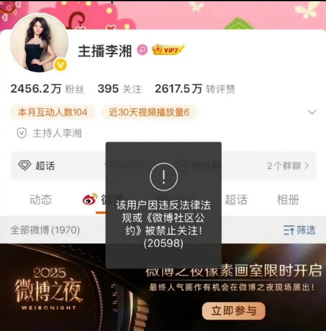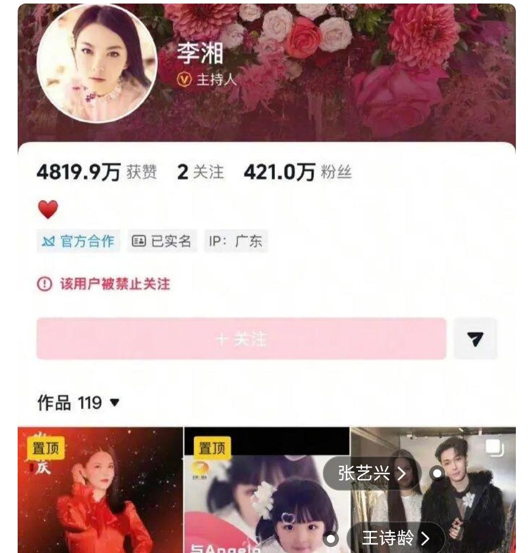 突发!知名主持人李湘多平台账号被禁止关注 1月16日,前湖南卫视当家花旦李湘的微博、抖音、小红书等多平台账号均被禁止关注。消息一出,引发全网关注和热议。 据悉,其微博坐拥2000多万粉丝,提示该用户因违反法律法规或微博社区公约,被禁止关注。 李湘,1976年2月10日出生于湖南省长沙市,毕业于中国传媒大学,主持人、演员,曾主持湖南卫视《快乐大本营》为众人熟知,还出演过《快嘴李翠莲》《四大名捕会京师》等电视剧。现任360娱乐总裁。 公众人物的影响力本身就大,向观众传递的应该是积极的价值观,而不是频繁展示财富,不然容易引起大家的反感。提醒大家作为公众人物必须谨言慎行!