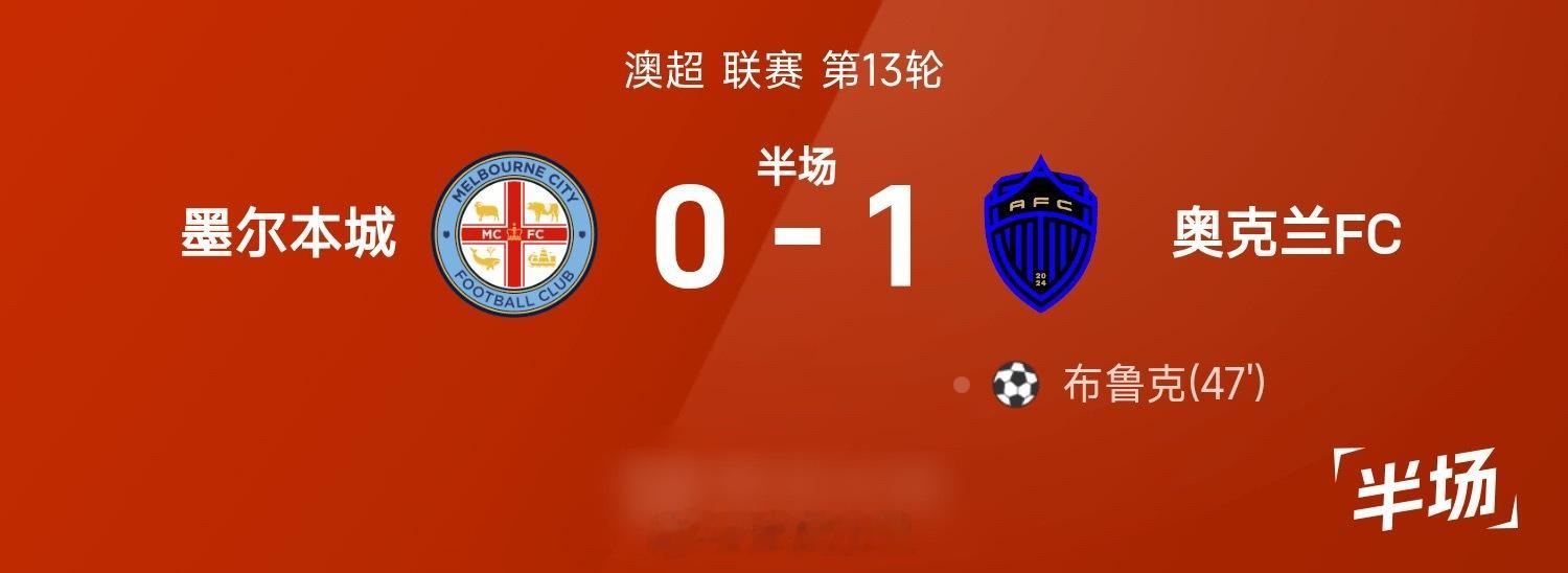 25/26赛季澳超联赛第13轮,墨尔本城迎战奥克兰FC。半场战罢,双方比分暂为墨尔本城0-1奥克兰FC,布鲁克破门建功。