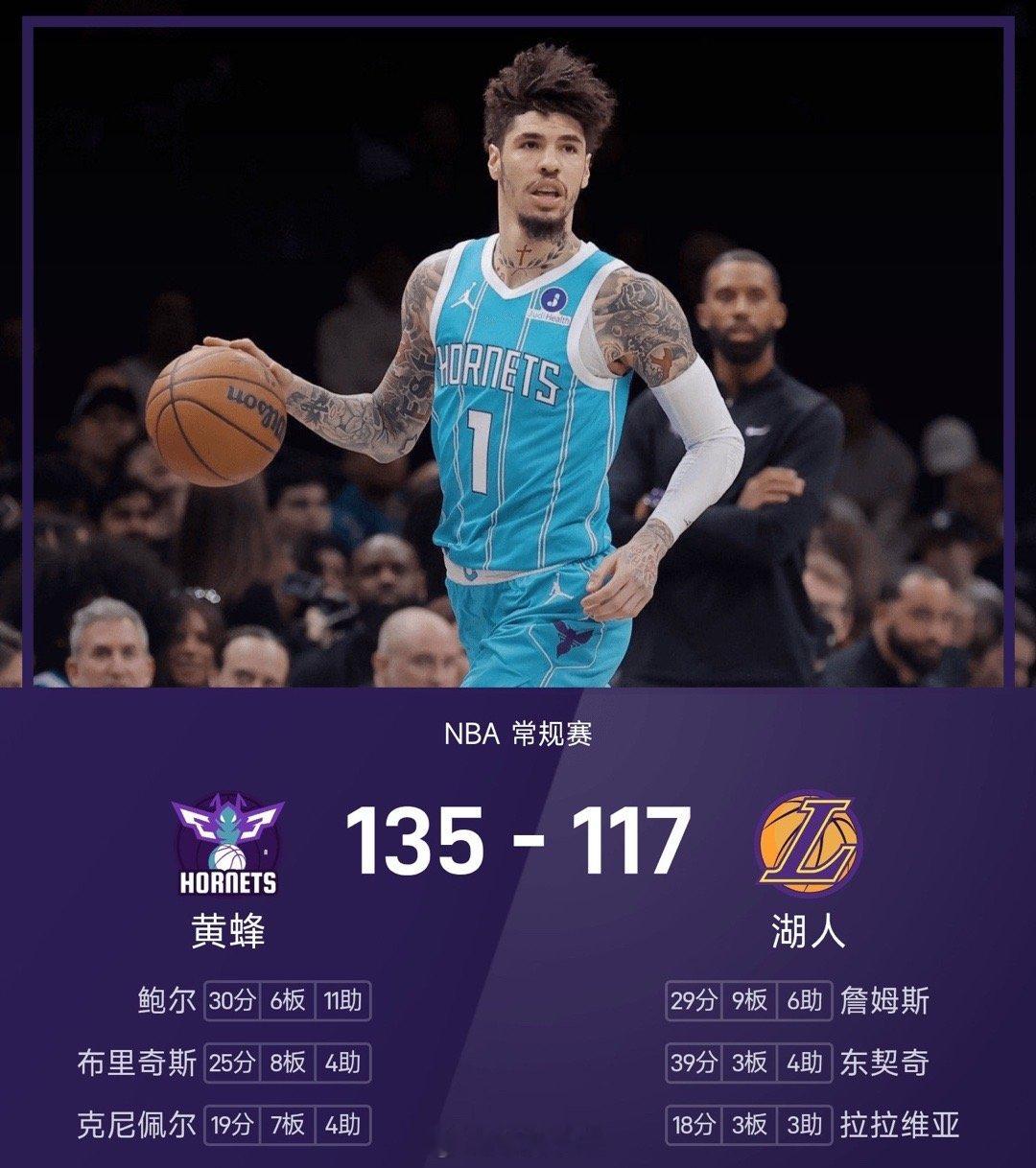25/26赛季NBA 常规赛,湖人对阵黄蜂。双方全场战罢,湖人117-135不敌黄蜂。鲍尔得到30分6板11助率队取胜,东契奇空砍全场最高的39分3板4助。