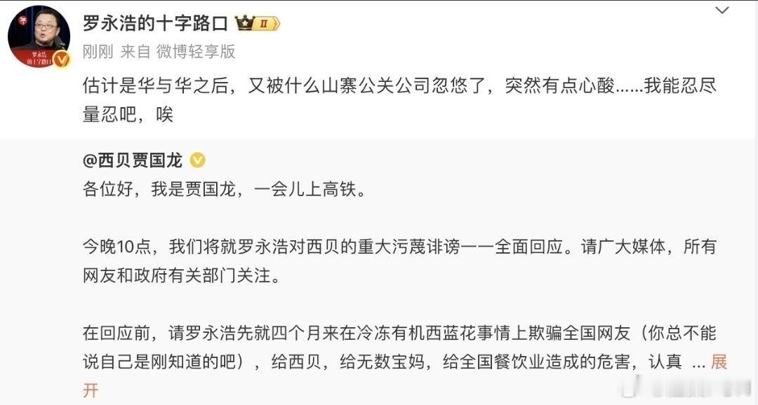 罗永浩回应贾国龙喊话 罗永浩直面贾国龙今晚10点的直播!他心疼剩下的西贝员工,说能忍就忍。
