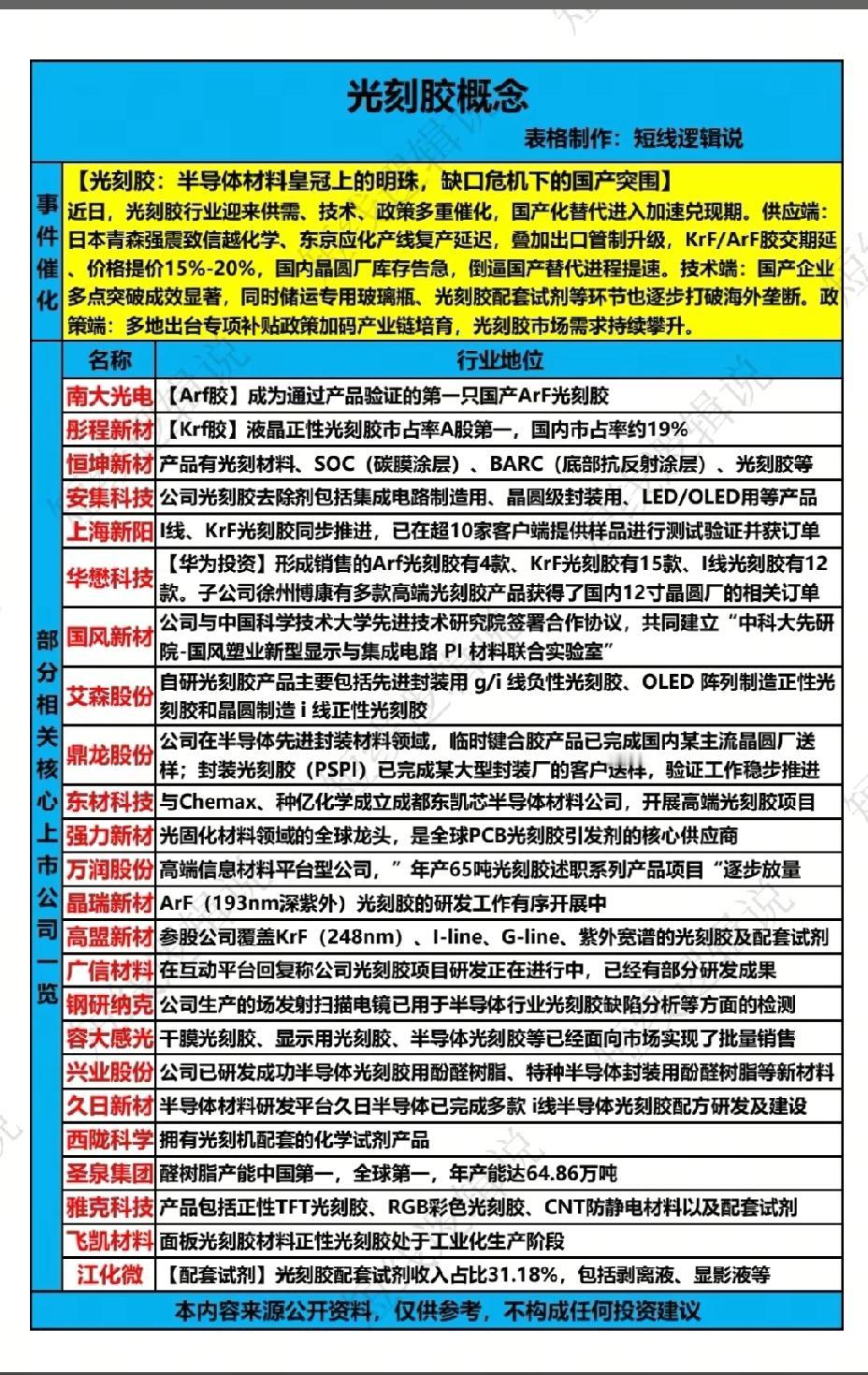 1月16日,下周A股这个板块有望大涨!!! 光刻胶半导体材料皇冠上的明珠,缺口危机下的国产突围,行业迎来供需、技术、政策多重催化,国产替代化进入加速兑现期,重点关注:南大光电、彤程新材、国风新材!!!