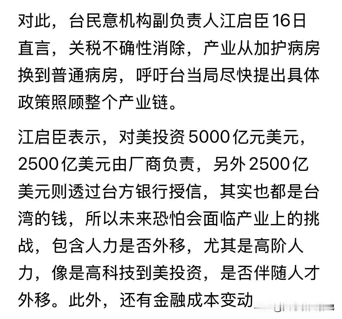 什么叫人至贱天下无敌?说的就是民进党当局。被美国抢了5,000亿美金不说,台积电也被抢走一大半,另外还得上供买人家不用的二手或者面临淘汰不用的武器,还得上供15%的关税。 关键是让绿蛤蟆党一宣传成了什么光宗耀祖的事儿,太丢脸了。说得粗俗一点,让美国人白嫖,居然还贴钱。 台湾媒体只敢报道台湾对美关税15% 但是不敢报道附加条件。美国商务部长鲁特尼克(Howard Lutnick )在协议公布后接受CNBC采访表示:台湾省和美国的关税协议规定,芯片产能的40%,要转移到美国生产。美方要求台湾省最低对美投资2500亿美元,如果违反协议或者没有落实,关税将提高到100%。