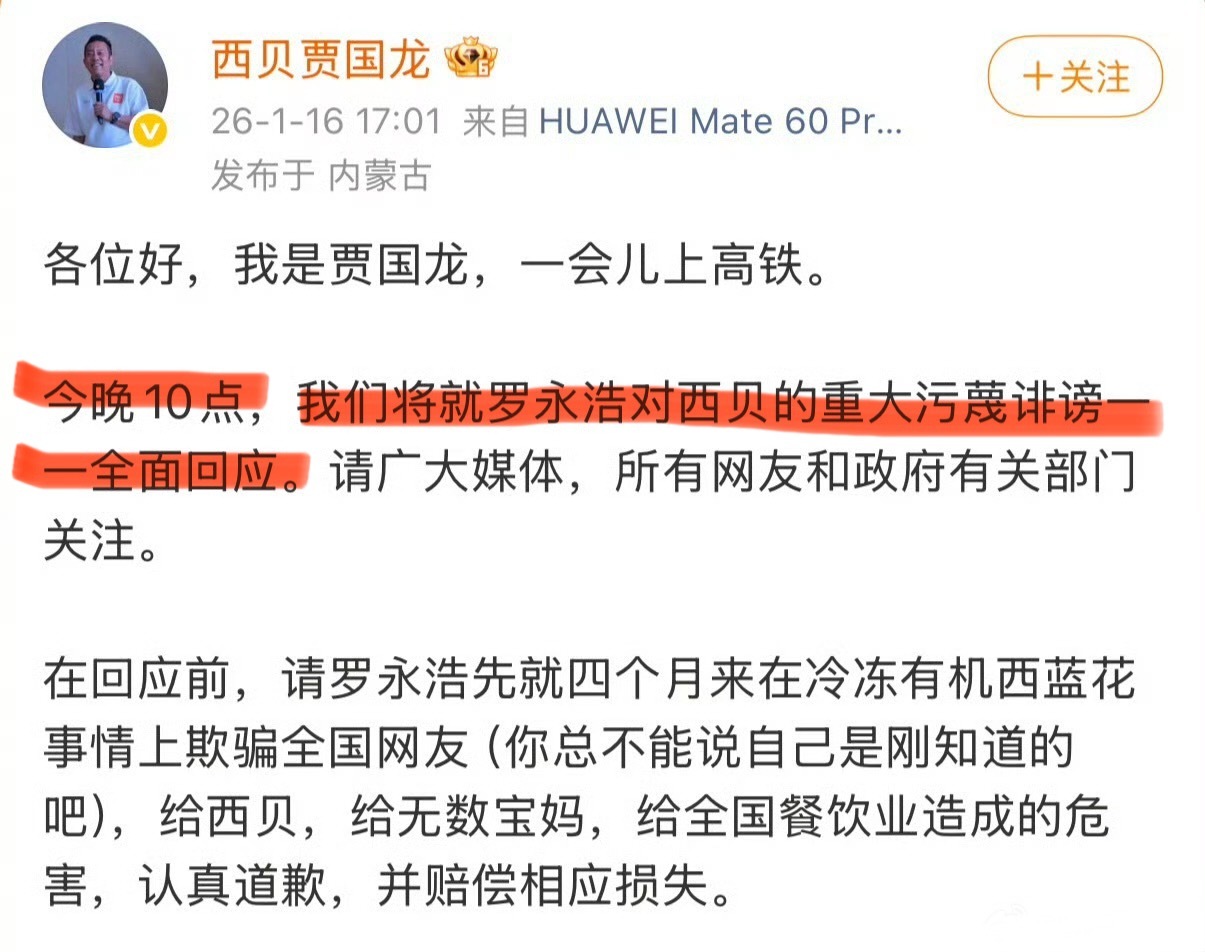 贾国龙说今晚十点将全面回应罗永浩的重大污蔑!