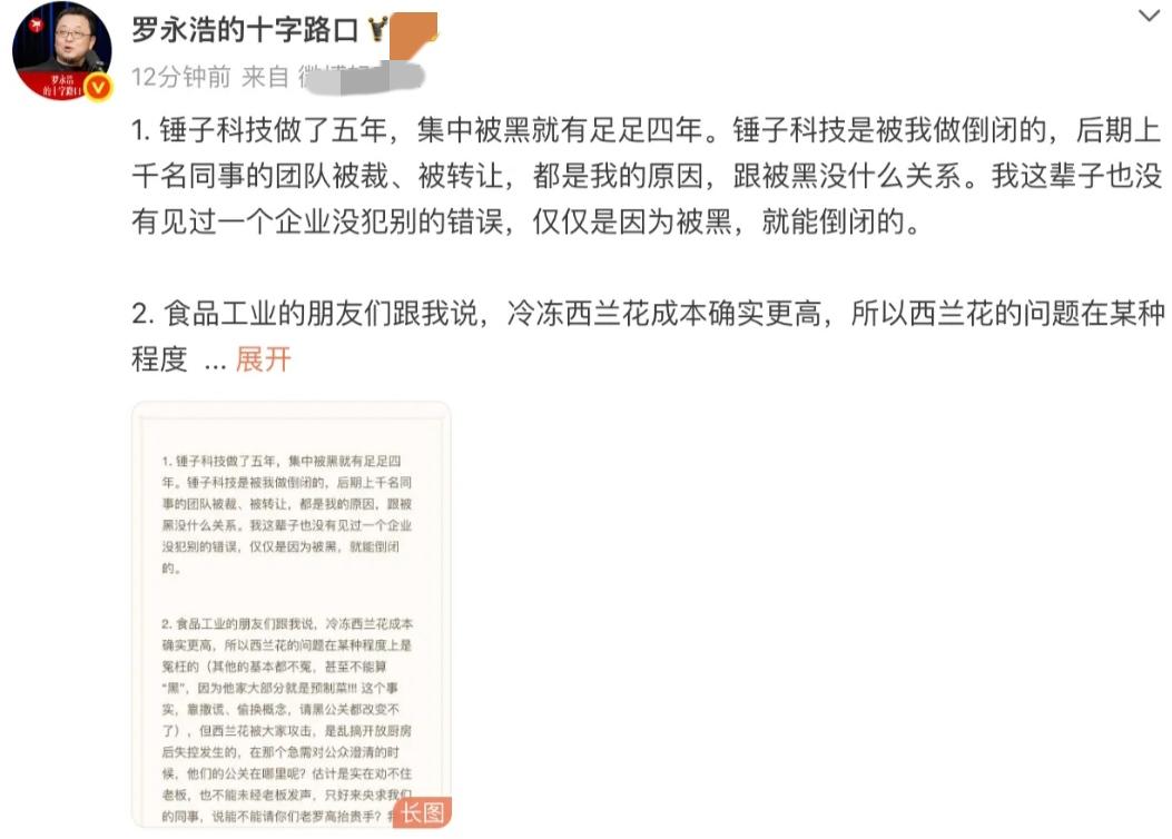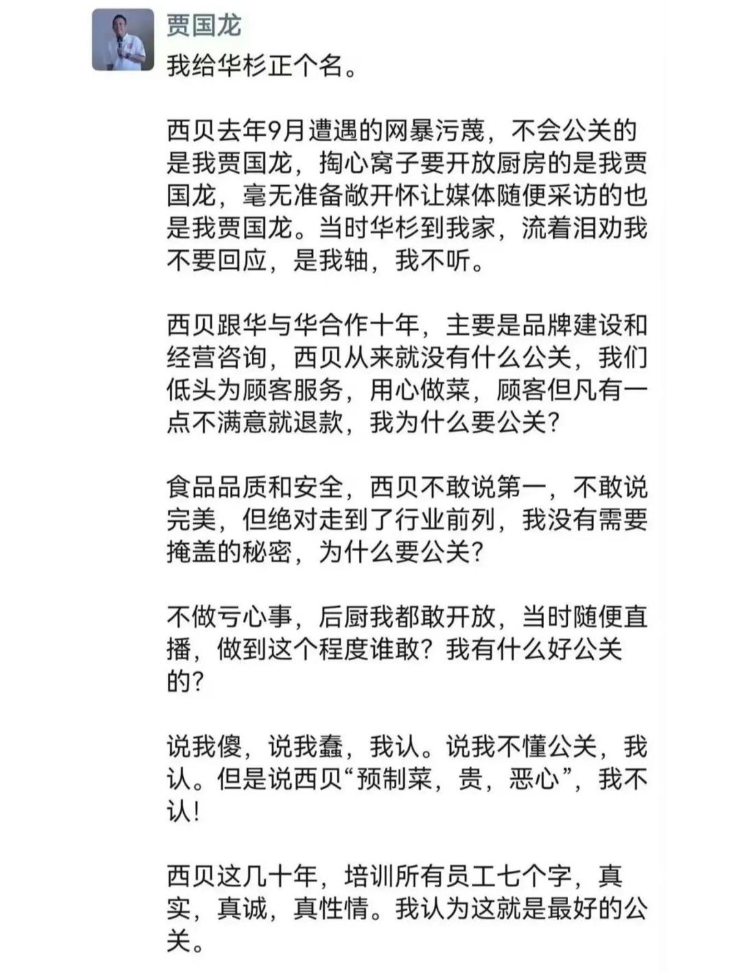 近日,贾总与罗永浩分别发文,对西贝关闭102家门店,等事宜做出回应。 贾总发文证实一次性关闭全国102家门店,承认公司遇到最大外部危机。 强调门店使用“中央厨房备菜”而非“预制菜”。 做好闭店善后工作,妥善安排离职员工,还有顾客。 他将全力挽救公司。 罗永浩发文,他以自己的锤子公司倒闭为例子说明一点,企业倒闭是因为自身决策失误,而不是被黑。 他坚持认为,对预制菜的质疑“基本都不冤”。 另外他指出,企业家若真担心员工失业,当初就不应该做出可能导致危机的决策。 目前来看,双方将会各自忙碌自己的事。 此事应该会画上句号。
