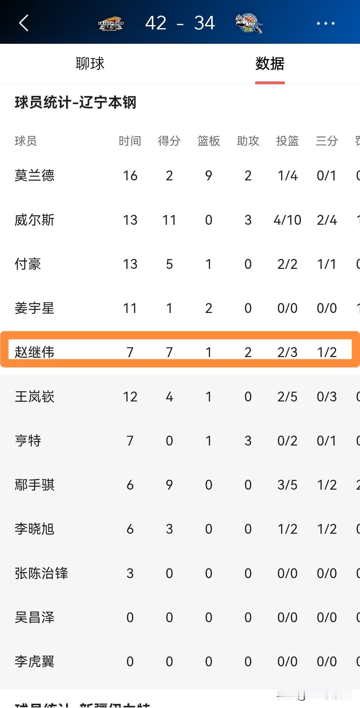 我忍不住要怒赞辽宁本钢当家控卫赵继伟!在今天辽宁本钢主场迎战新疆伊犁特的比赛中,目前双方半场战罢,辽宁本钢以42:34领先对手。值得一提的是,伤愈复出的赵继伟立刻给球队带来了立竿见影的改变,辽宁本钢的进攻明显好了很多。 在前两节比赛中,赵继伟首发出战7分钟,投篮3中2,其中三分球2中1、罚球2中2得到7分1篮板2助攻,没有出现任何的失误,他的场上正负值为+7。 我相信随着赵继伟的回归,辽宁本钢一定会再次走上赢球的轨道,辽宁本钢即将迎来一波连胜了。