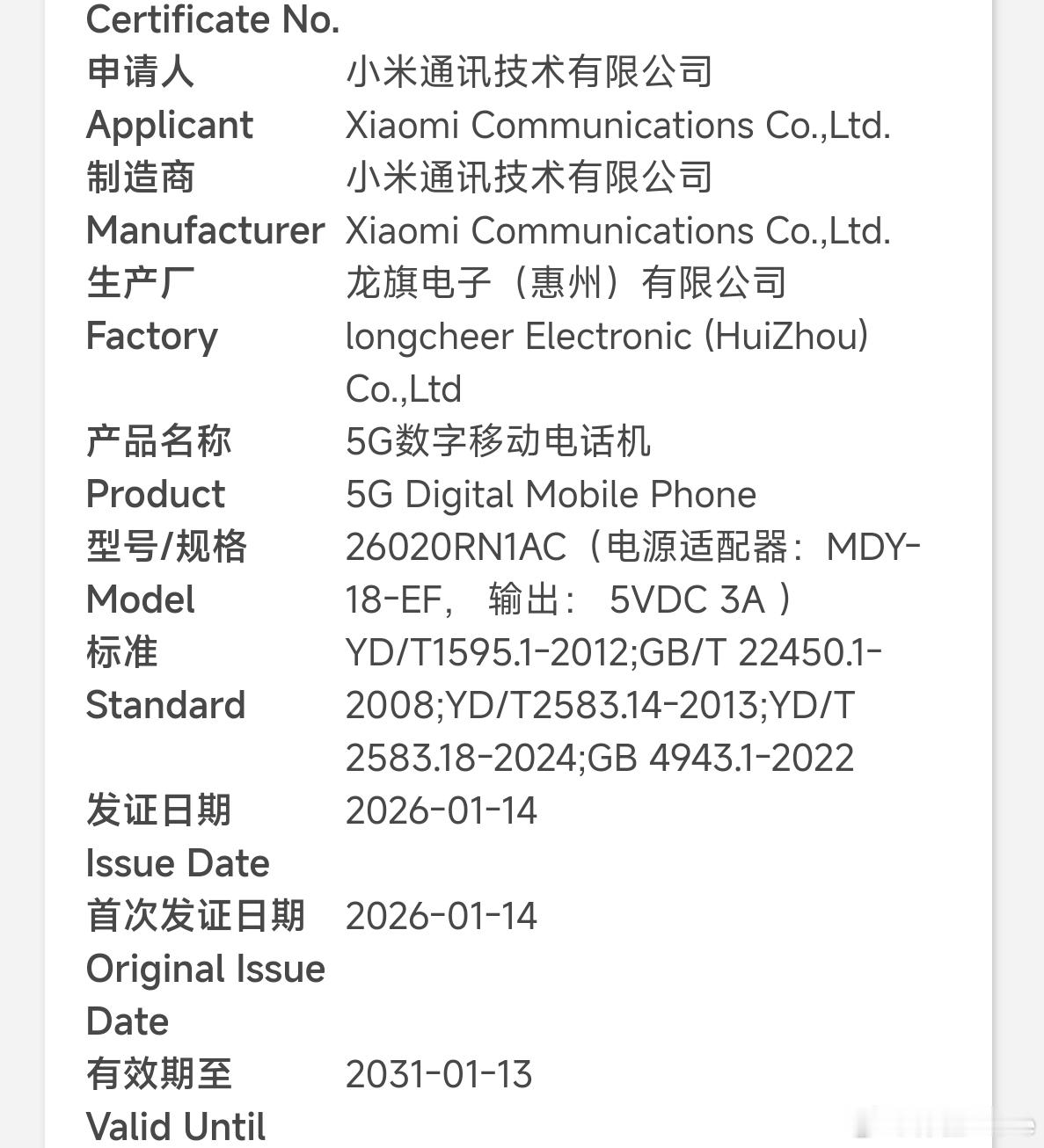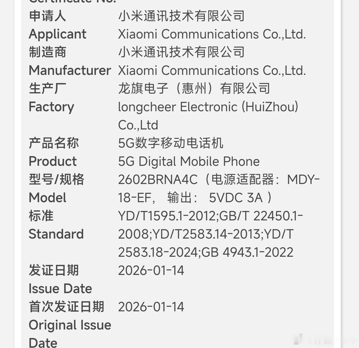 红米两款数字系列通过质量认证,2602,上市不远了。电源适配器给的是15W,根据以往经验,有可能手机支持的充电功率更高。