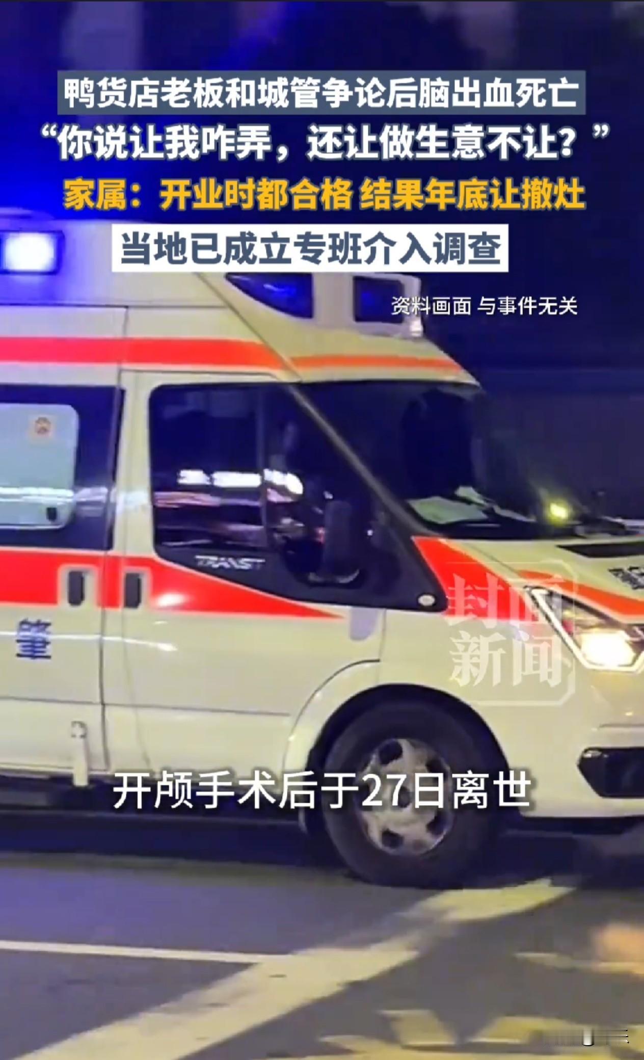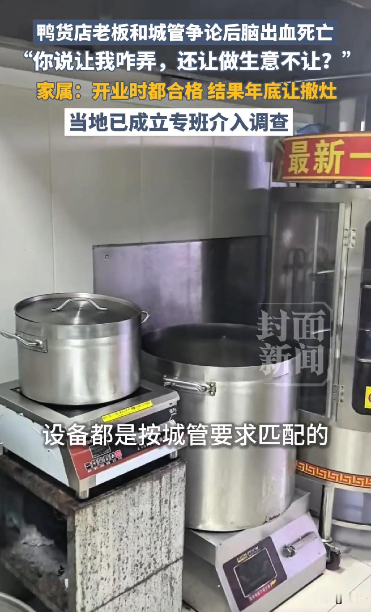 卖鸭货老板朱俊峰和城管发生争执,没过5分钟直接晕倒,送医院做了开颅手术,扔无济于事,27号走了。 家属说设备都是按城管的要求弄的,也经过了城管部门的验收,可到了年底,三天两头来找事。 尤其是出事前的这几天,城管上门让撤电灶,没出示证件,也没说清到底是因为啥。 监控里能看到,12月24号那天,老板急大声嚷嚷:“我只开一个火都不让,这也不行那也不行,我跳楼去吧!” 城管那边说:“这是我的工作,回去该咋汇报咋汇报。” 现在官方说了,附近PM2.5高,现在在排查,涉事城管当时没开执法记录仪,家属质疑执法不合理,当地已经成立专班调查了。 好好的一个做生意的人,就这么没了,谁看了不难受?大家都盼着调查组能查个水落石出,给个公正的说法。 其实,城管管理城市是职责,但老百姓做点小买卖也不容易。执法得有规矩、讲依据,更得有点人情味。 管理是为了让城市更加的有序,不是把人逼得没路走。 真希望以后能多些平和沟通,少些冲突,别再出这样的悲剧了。 信息来源:澎湃新闻 周口城管执法事件
