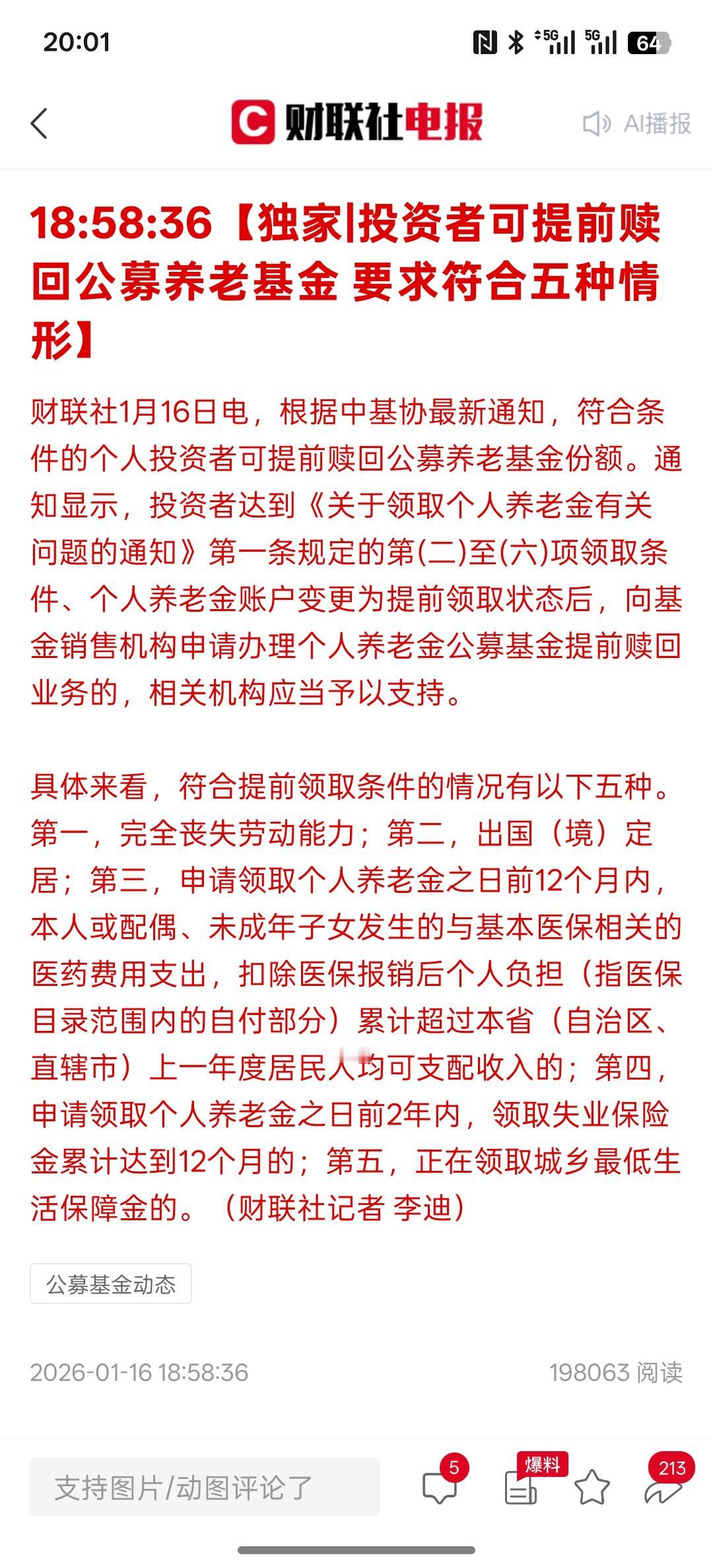 利好股市长期投资,独家|投资者可提前赎回公募养老基金 要求符合五种情形! 对于养老基金很多都是投资资本市场,而且养老基金有助于资本市场长期稳定的发展!中国目前在基金规模上面越来越大,而且基金投资的频率越来越多,大量的机构资金也在不断的投向资本市场,而根据养老基金也在资本市场形成了支撑作用!