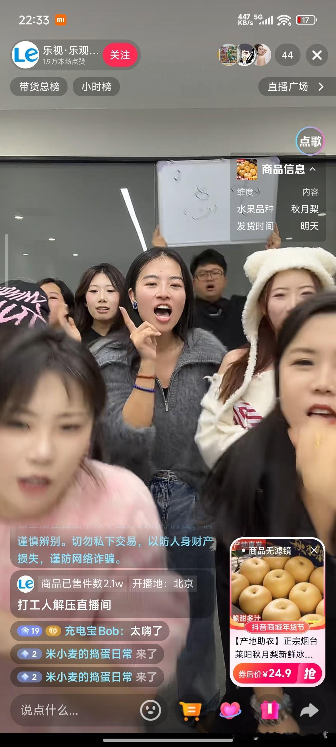 破产的乐视,靠“打工人直播间”杀回抖音顶流了! 谁能想到,当年欠了122亿、差点消失的乐视,如今靠一群员工在直播间里唱歌跳舞卖秋月梨,火成了现象级! 没有豪华设备,没有专业主播,就是一群乐视的普通员工,下班后排排站,拿着麦克风唱《勇气》《阳光彩虹小白马》,弹幕全是“这才是打工人该有的快乐”“比那些假笑的带货主播真实一万倍”。 更绝的是,他们卖的秋月梨已经爆卖46.3万单,单日带货2.1万件,直播间直接成了打工人的“精神按摩房”。评论区全是“买梨是假,看他们解压是真”“乐视这波是把破产玩成了真人秀”。 你说这到底是乐视的绝地求生,还是打工人的集体情绪宣泄?乐视这波操作,算不算把“摆烂”玩成了财富密码?