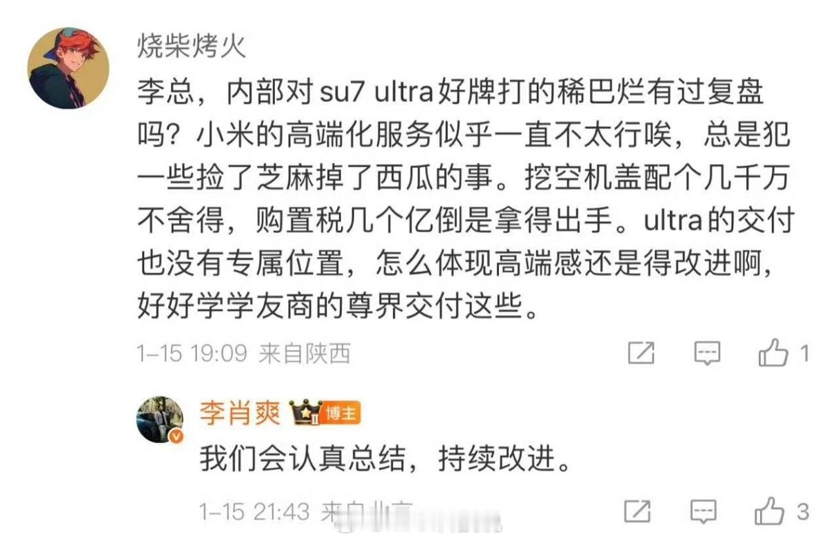小米SU7 Ultra的操盘,确实得好好总结,发布时的超级爆款,现在每个月100左右了,其实这也说明了用性能车来抢56E这种客户是不现实的。当然这种性能车市场,本来也就那么大,我觉得这是根本性原因,而且真有钱买这车的,基本都是不差钱,家里也还有别的车的另外一开始对于挖坑机盖需求的预判失误,后面的挖孔机盖的宣传问题,还有后续操作,都是有问题的,尤其是挖孔机盖,其实一开始承诺后面会免费升级,并且在等待期间,每个月给补偿的话,会好很多。最后我对于SU7 Ultra下一代产品的期待:一是产品命名独立,不要再挂SU7 头衔了,直接新命名,会更能突出其特别感,尤其是现在业内Ultra命名泛滥,SU7 Ultra的命名其实不太合适了。当初叫SU7 Ultra很大程度是给SU7引流(确实也很成功,发布后SU7订单反弹),但是现在,这个系列,我觉得是要为整个小米汽车品牌形象服务的。二是外观设计独立出来,和SU7完全差异化,得让人远远一看就知道这不是SU7,是豪华性能轿车。独立出来后的,可以和双门轿跑(曝光)配合,做一个全新的豪华性能系列产品,这两款产品就是小米极致性能操控的王牌代表,同时也是冲击纽北的巅峰之作。三 往上提价,控量,前一代已经卖了太多,下一代感觉很难再现那种盛况,所以可以提价做最极致的性能车,打造稀缺性,当然相应的服务一定也要做好。大家觉得呢?
