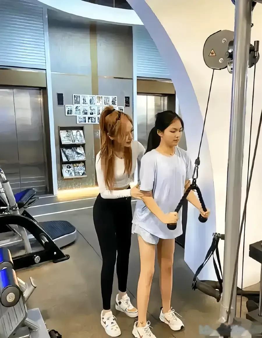 照片里是李湘的女儿王诗龄,在女健身教练的指导下,进行健身锻炼的情景。 李湘为了女儿,也是下了重金聘请教练,对女儿进行专门的健身训练。