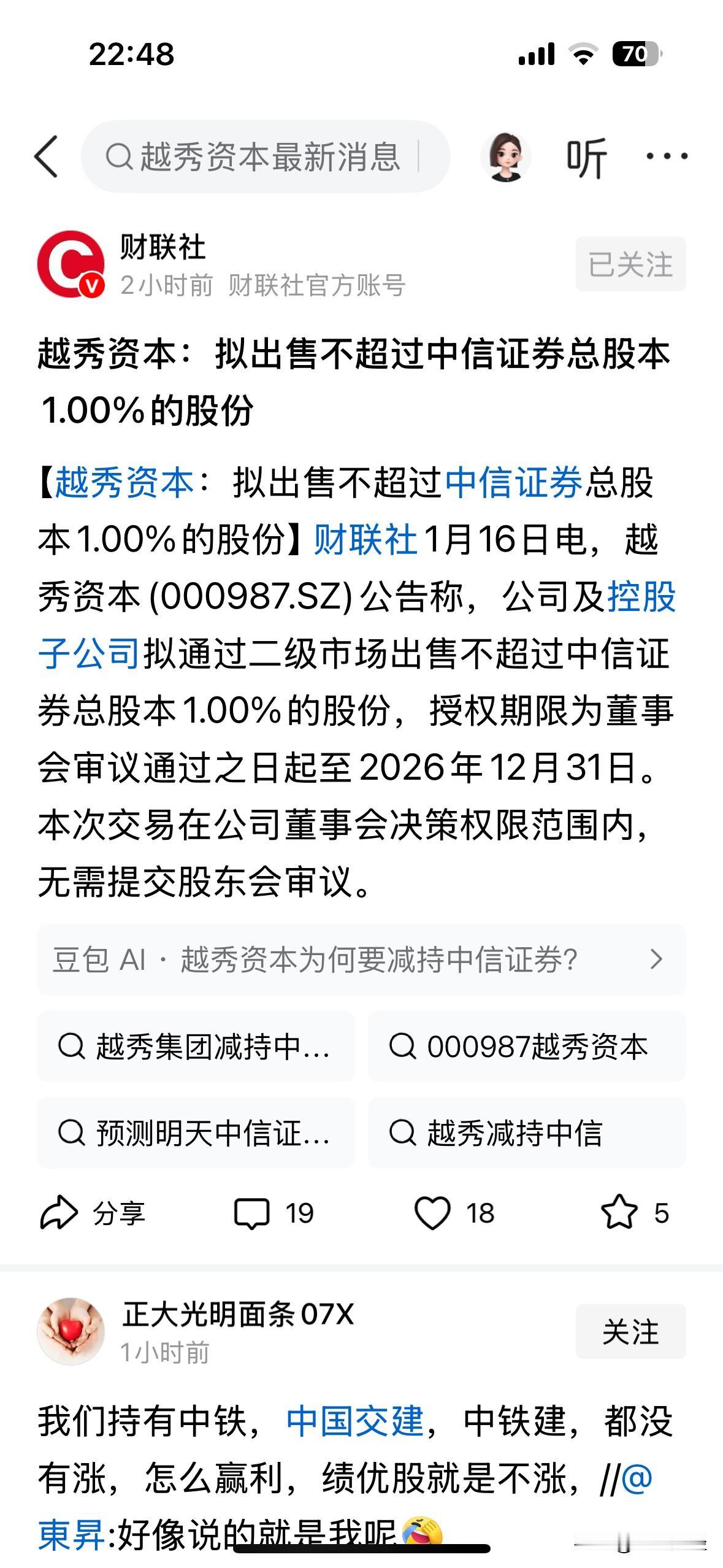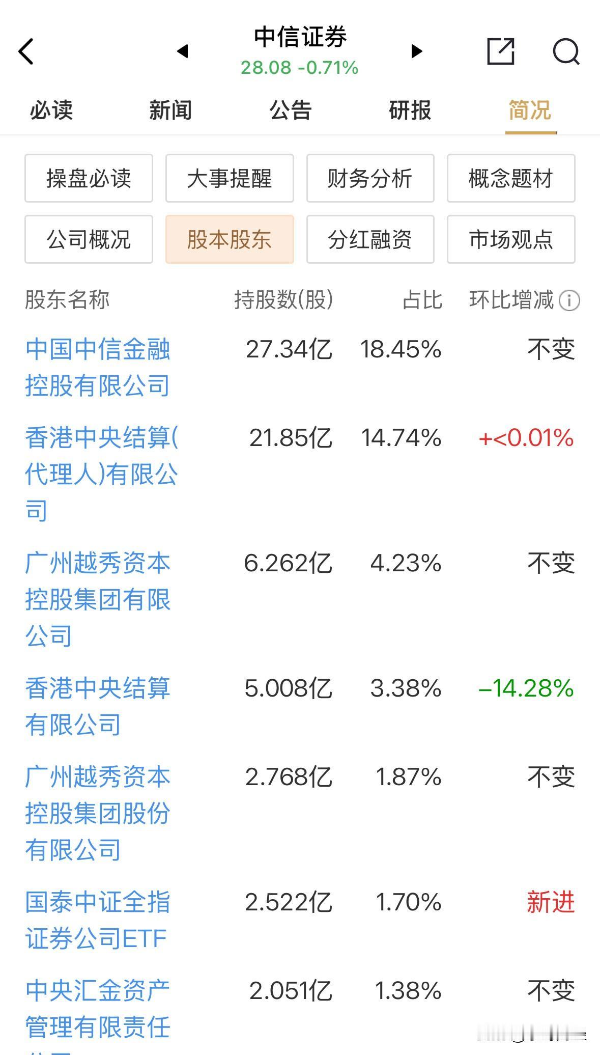 个人这才又买了点,但盘后又碰到减持了,A股的坑太多了吧? 第三大股东的越秀资本,拟减持1%的中信证券,这不会是脑子秀逗了吧。 中信证券才发布的300亿元史上最强的业绩预告呀?借利好出货,也不是长期股东该干的事吧,纯纯的拆台啊! 中信证券今收跌0.71%,市值约4160亿元,14倍不到的市盈率,也公告减持?越秀缺钱缺风了吗? 但个人突然觉得,不是5%以下的占股比例,不需要公告吗? 偷着笑吧就可以啦。 各种利好都不涨,事出反常必有现象,感觉离中信证券有大消息越来越近啦!