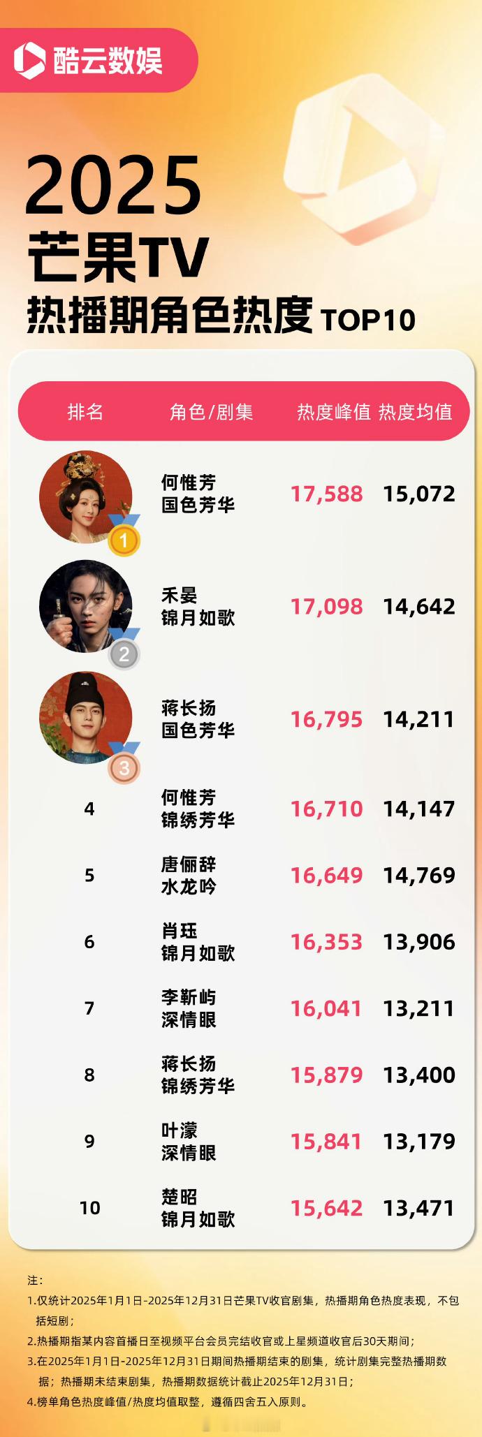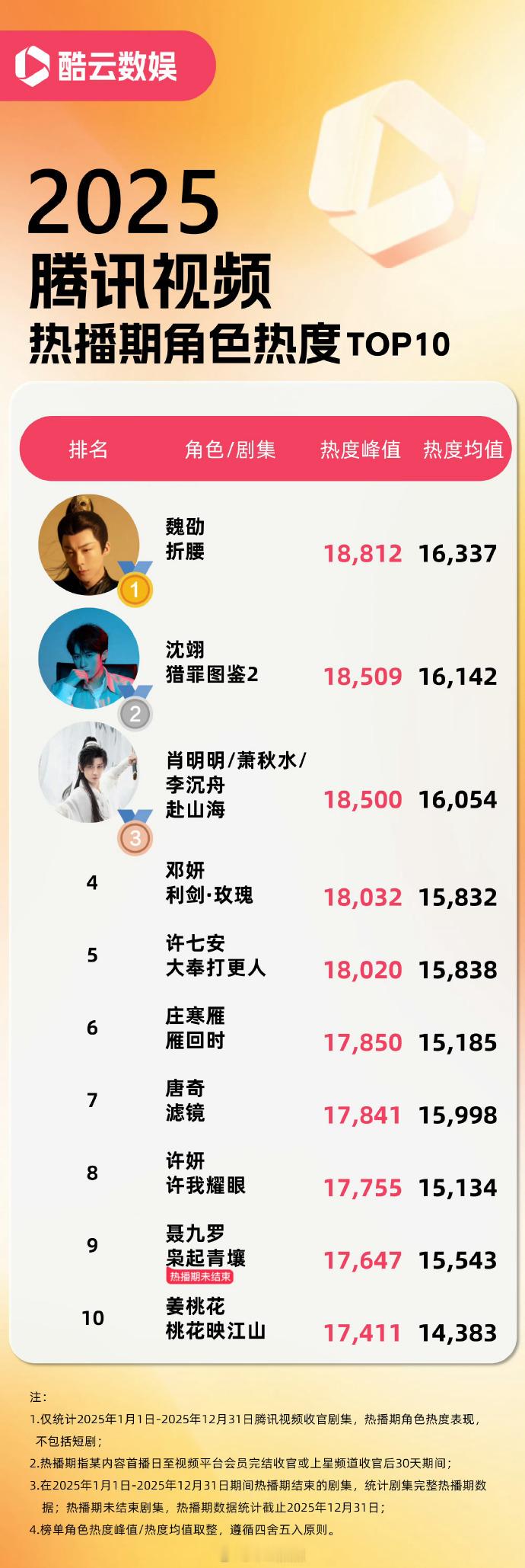 酷云2025年四大平台剧集角色热度榜🐧刘宇宁 《折腰》魏劭檀健次《猎罪图鉴2》沈翊……👖肖战 《藏海传》藏海虞书欣《嘘,国王在冬眠》卫枝……🥭前三名杨紫《国色芳华》何惟芳周也《锦月如歌》禾晏李现《国色芳华》蒋长扬🥝檀健次《猎罪图鉴2》沈翊白鹿《白月梵星》白烁……
