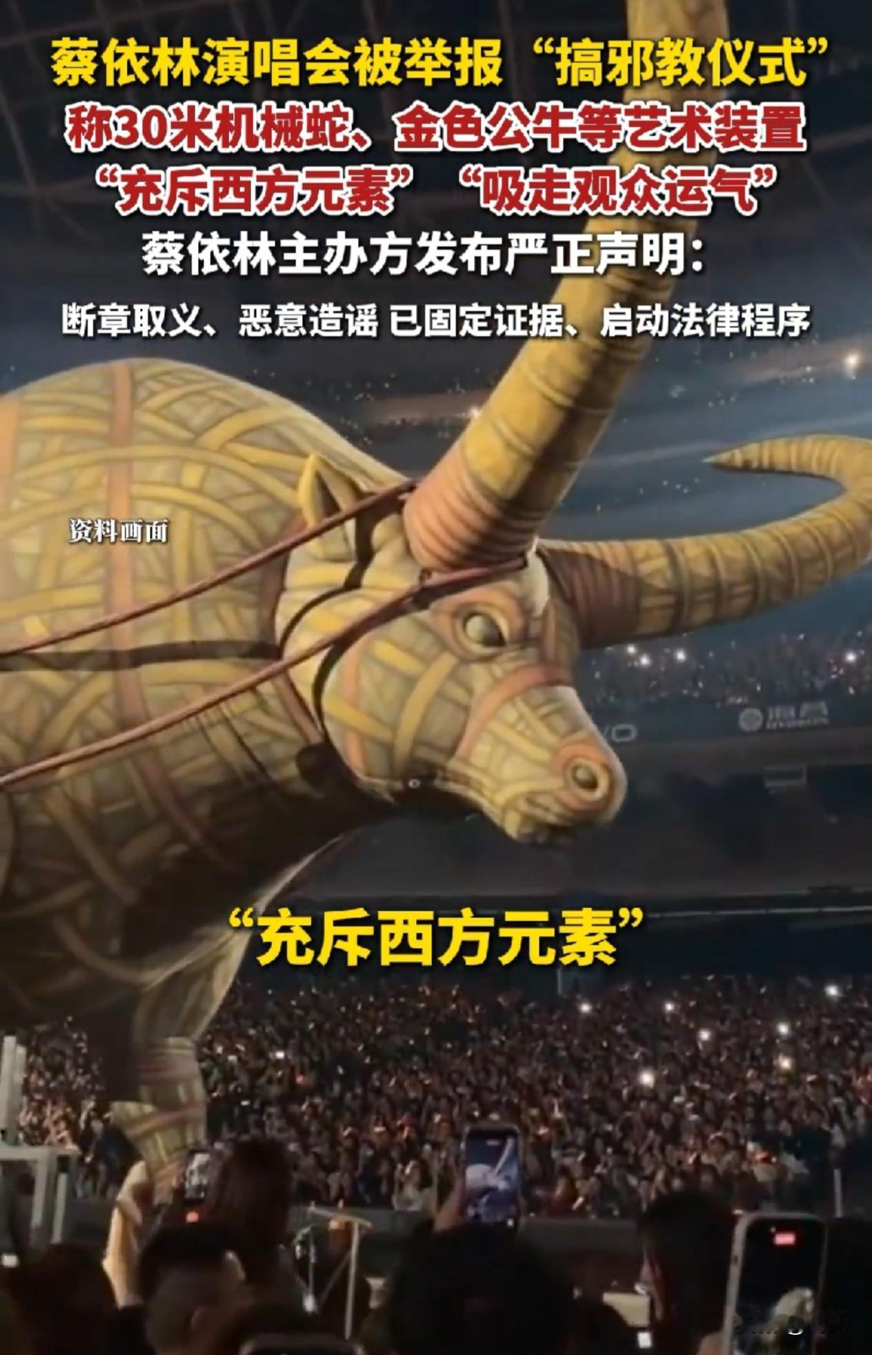 蔡依林演唱会被举报“搞邪教形式”冲上热搜! 有网友举报她演唱会的舞台设计像邪教仪式,说30米机械蛇、金色公牛这些装置全是西方元素,还说会吸走观众运气,这事儿直接冲上了热搜。 对此,蔡依林工作室和主办方很快发了严正声明,说举报账号是断章取义、恶意造谣,已经固定证据要走法律程序,绝不姑息这种损害名誉的行为。 其实演唱会搞点特别的舞台设计很常见,大多是为了让演出更精彩,视觉效果更好,哪有那么多别的说法。 网上信息杂,遇到看不懂的事儿,可别瞎猜乱传,很容易冤枉人。艺术表达本来就多种多样,舞台设计是创作的一部分,没实打实的证据就往不好的地方联想,真挺不严谨的。 还是那句话,说话得基于事实,别传没影儿的事儿,这样网络环境才能好,艺术创作也能更自由些。 蔡依林演唱会 舞台设计争议 网络谣言
