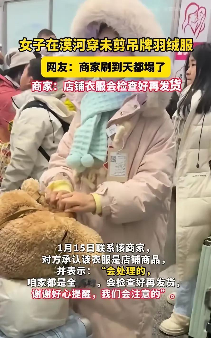 “白嫖”?黑龙江漠河,一男子旅游时突然觉得一名排队的女生不错,可走到前面一看,却瞬间下头,因为她的羽绒服上面竟然挂着一个大大的吊牌,男子猜测大概率这是准备回去退掉的,有意思的是,这个事火了后,羽绒服商家也在网上看到了这件衣服。 那天漠河零下三十多度,风刮在脸上像刀子似的,大家都裹着厚厚的羽绒服缩着脖子。男子本来还想上去搭个讪,结果看清那明晃晃的吊牌,瞬间没了兴趣。他把这段经历拍下来发到网上,配文“本来想追,一看吊牌直接放弃,这是穿完就退的节奏啊”,没想到一下就戳中了网友的笑点。 评论区直接炸锅,有人调侃“商家刷到这条视频,连夜把质检部门开除了”,有人脑补“女生回去申请退款的理由:衣服质量太差,在漠河冻得我瑟瑟发抖”,还有人翻出自己遇到过的类似经历,说曾经买过一件羽绒服,拿到手发现吊牌上还沾着滑雪场的雪。 很快,涉事商家也刷到了这条视频。他们连忙出来回应,说自家衣服发货前都会仔细检查,吊牌肯定是顾客自己没剪,还承诺会加强质检。这话听着官方,可明眼人都懂,“穿完就退”早已是网购圈里心照不宣的潜规则。尤其是冬天的羽绒服、大衣,不少人买新衣服只为拍照打卡、出门旅游穿一次,回来就以“七天无理由”退货,商家只能默默收下这些“二手新衣”,再卖给下一个顾客。 这种行为看似占了便宜,实则是在消耗整个网购环境的信任。商家为了降低损失,要么提高售价,要么在衣服上做手脚,最后吃亏的还是普通消费者。更讽刺的是,女生在零下三十度的漠河穿着新衣服拍照时,可能觉得自己精明又省钱,却不知道这件衣服会带着她的体味和寒气,被送到另一个陌生人手里。 我们总说“己所不欲,勿施于人”,可在“薅羊毛”的诱惑面前,很多人都忘了这个简单的道理。一件羽绒服的价格或许不贵,但这种“用完就扔”的心态,正在一点点啃食人与人之间的善意。 各位读者你们怎么看?欢迎在评论区讨论。