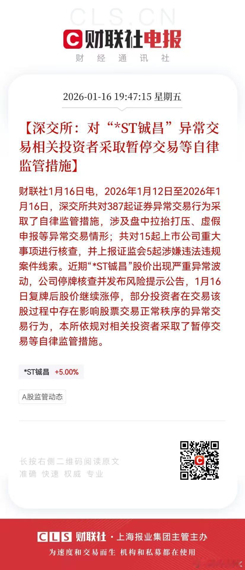 深交所:对“*ST铖昌”异常交易相关投资者采取暂停交易等自律监管措施已经是铁了心了造孽