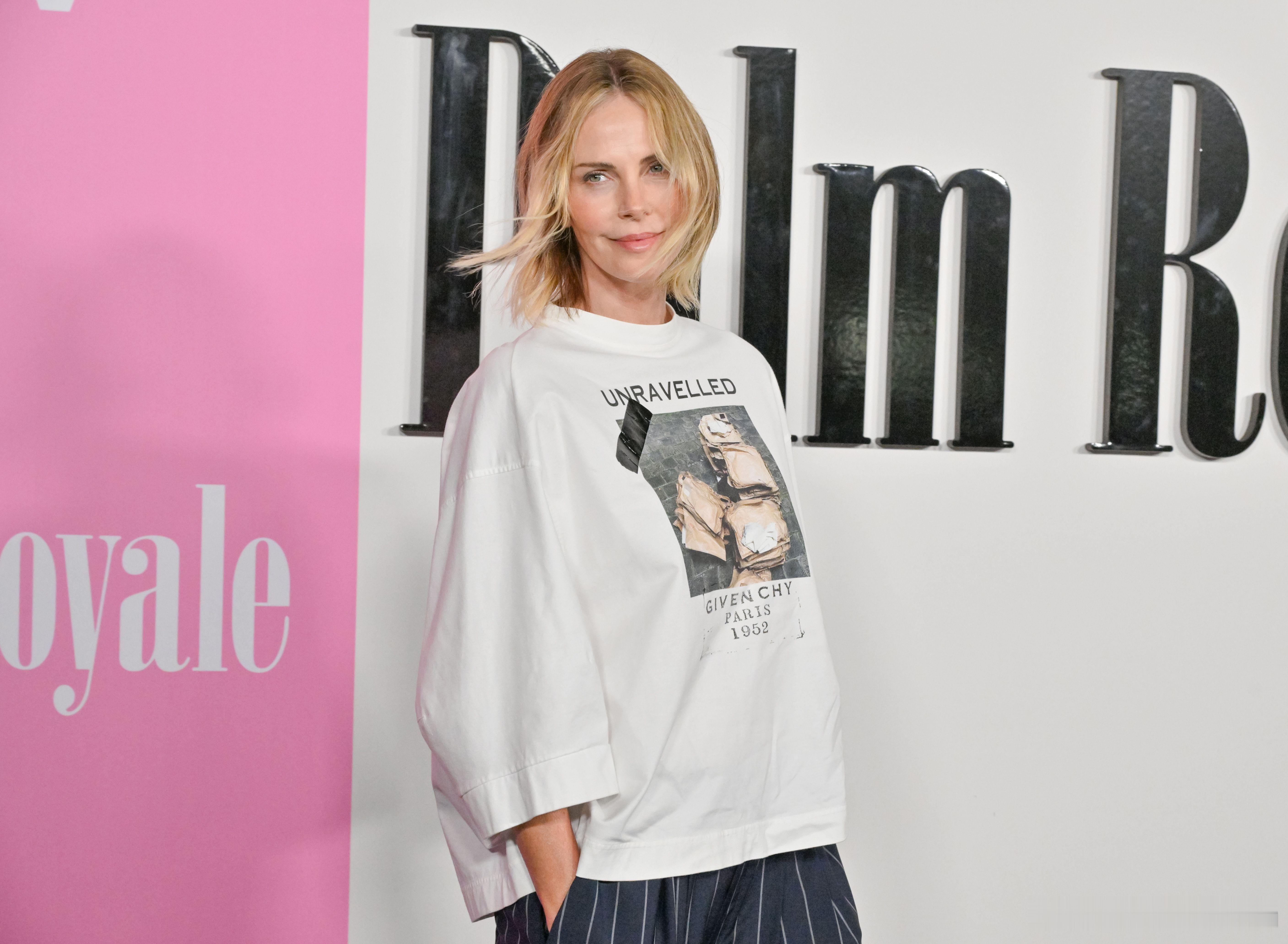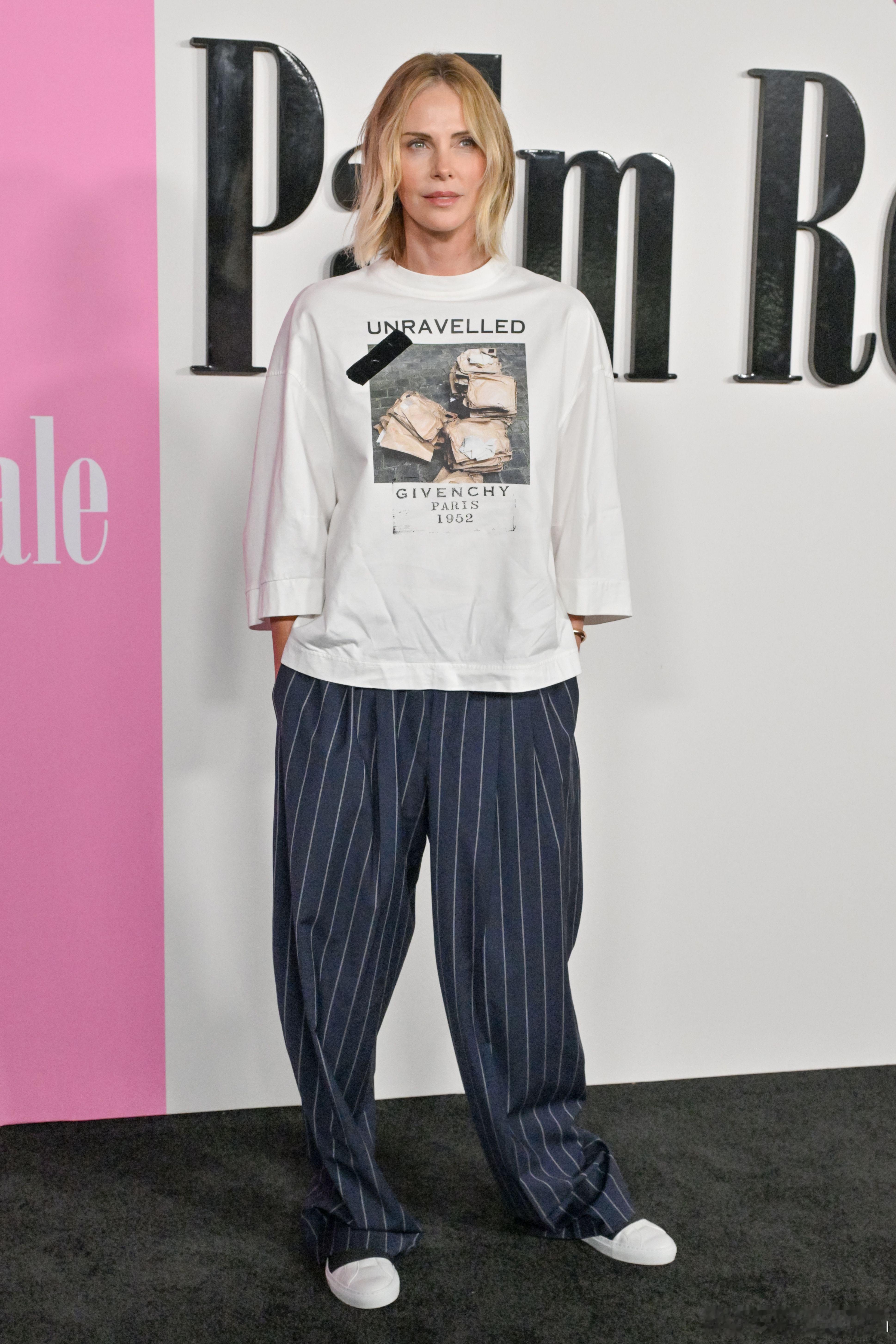 charlize theron查理兹塞隆在洛杉矶出席美剧《皇家棕榈》的艾美奖拉票活动,塞妈穿着一件宽松的纪梵希体恤搭配条纹长裤亮相
