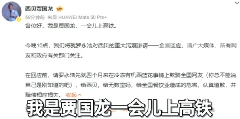 贾国龙晚上10点又开战了! 插了4个月的氧气管,终于要在今晚拔了,两个人开直播呗 感觉贾国龙吵架吵输了,回家越想越气,然后开始复盘模拟,然后觉得自己又行了。估计是看了军儿直播感触了,有卧龙必有凤雏! 贾国龙要开直播,凭借着他的回应,语言组织和情绪控制,毫不怀疑他会被吊起来锤,想想确实心酸。贾总一直耿耿于怀的,是算不算“预制菜”这个点,因为预制菜标准是他们参与制定的,从理论层面把自己的菜,排除在预制菜之外了,所以他一直想用这个“标准”来证明,自己的菜不是预制菜。 他至今还觉得问题在于罗永浩,好像干掉罗永浩就万事大吉