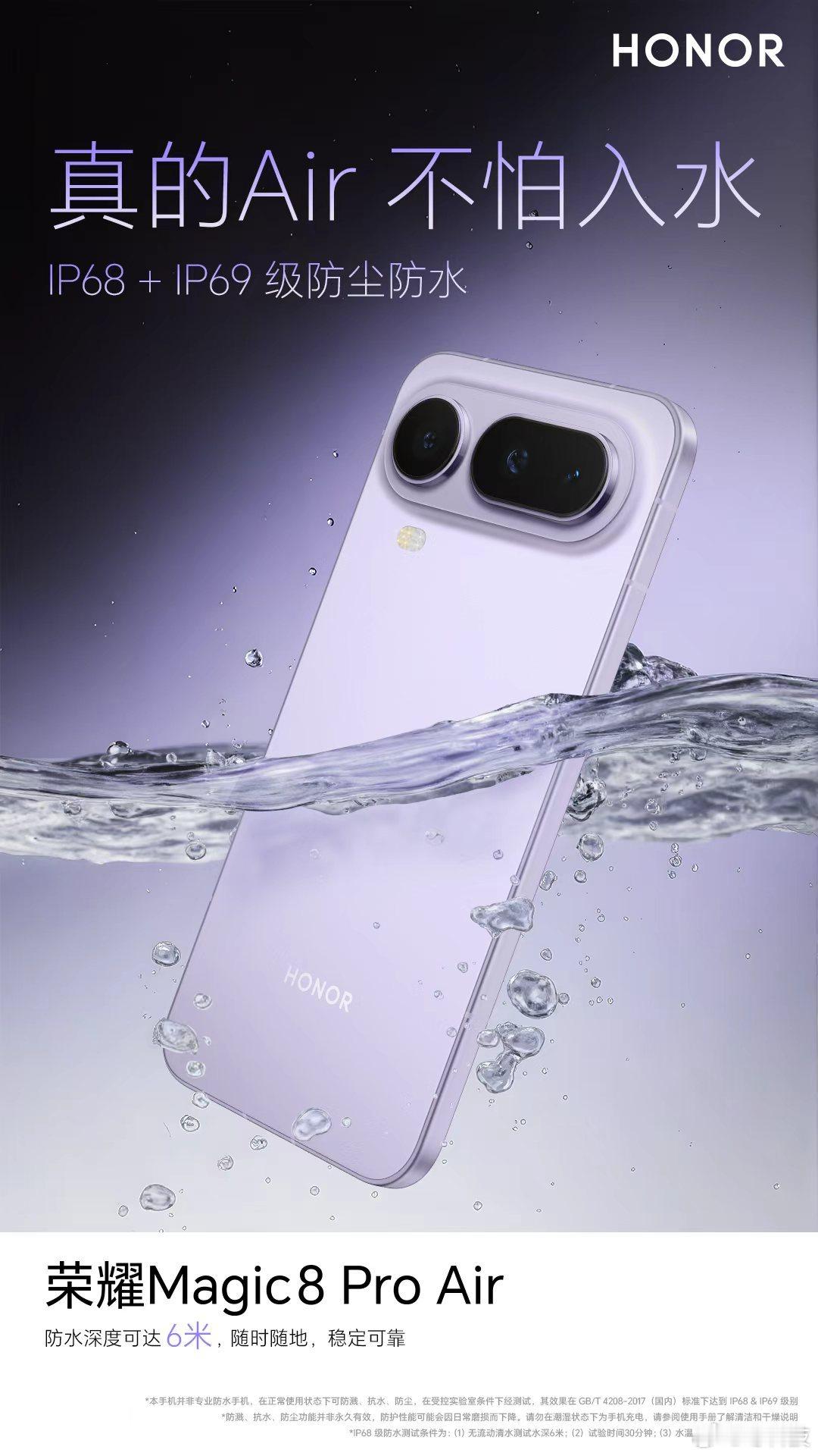 荣耀Magic8 Pro Air轻薄机身和性能真的是可以兼得,6.1mm、155g超薄手感下,搭载eSIM+实体SIM四卡双待、IP68&IP69K满级防尘防水、自研高强7系铝中框与立体双扬声器,这次都做到了!