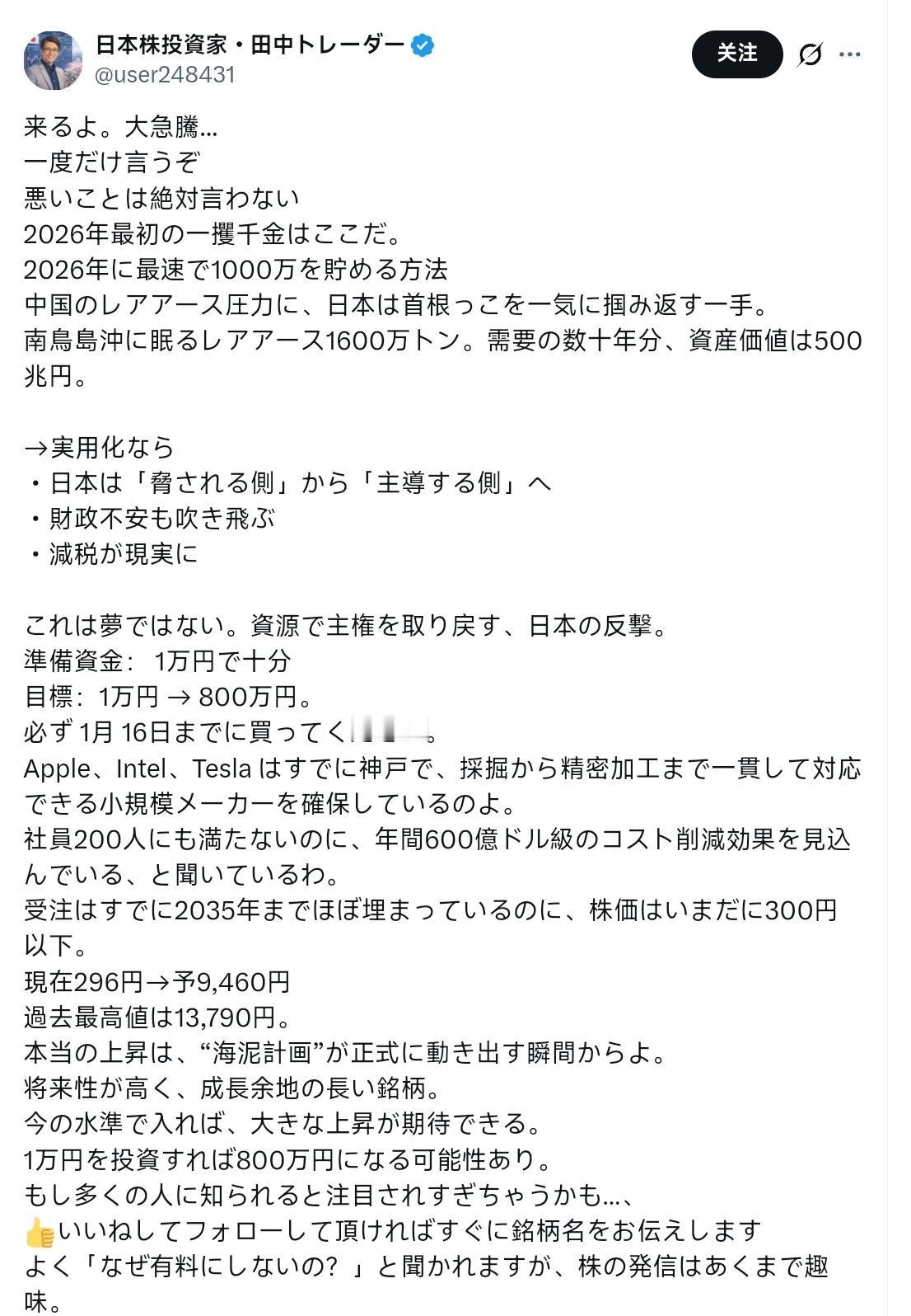 日本股市神棍:它要来了。一股巨大的浪潮…… 我再说一遍,我永远不会说任何坏话。 这是你2026年第一个快速致富的大好机会。 2026 年最快节省 1000 万日元的方法:日本采取重大举措,遏制中国稀土供应压力。 南鸟岛海岸附近蕴藏着 1600 万吨稀土,足以满足未来几十年的需求,资产价值达 500 万亿日元。 →如果这成为现实,日本将从受到威胁的国家转变为引领国家的国家,财政担忧将被消除,减税将成为现实。 这不是梦。日本将凭借自身资源奋起反击,重夺主权。 所需资金:10,000日元即可。目标:10,000日元→ 800万日元。 请务必在1月16日前购买。 苹果、英特尔和特斯拉在神户已经拥有小型制造工厂,可以处理从采矿到精密加工的所有业务。 我听说他们预计每年可以节省 600 亿美元,尽管他们的员工不到 200 人。 尽管订单几乎已经排到了 2035 年,但股价仍然低于 300 日元。 当前价格:296日元→预测价格:9460日元,历史最高价格:13790日元。 真正的上升趋势将从“海泥计划”正式启动的那一刻开始。 一只具有巨大未来潜力和长期增长潜力的股票。 如果你以当前价位买入,预计会有大幅上涨。 如果你投资1万日元,就有可能将其变成800万日元。 如果很多人知道了,可能会引起过多关注…… 👍如果您喜欢并关注我们,我们会立即告诉您股票名称。我经常被问到“为什么不收费?”,但发布股票信息只是我的一个爱好。