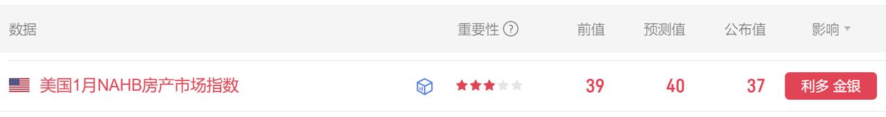 今晚美国房地产市场指数公布了。 美国1月NAHB房产市场指数 37, 市场预期40,前值39。 该数据是利多金价的, 但是没能引发国际金价的上涨。