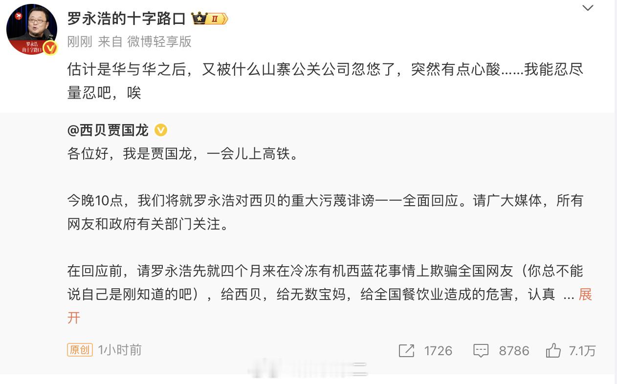 还真整成连续剧了其实西贝的真正问题是什么?理念没有走出来中餐标准化建设的自己的管理理念还是把北美商学院里面的管理模式带入到中高价位中餐里面了无论你承认不承认,跪着还是站着中餐是比西餐高端的多的东西那低端货的管理思路往高端货上带入这才是这个行业最大的问题还是要走出中餐标准化建设的自己的管理思路啊罗永浩回应贾国龙喊话