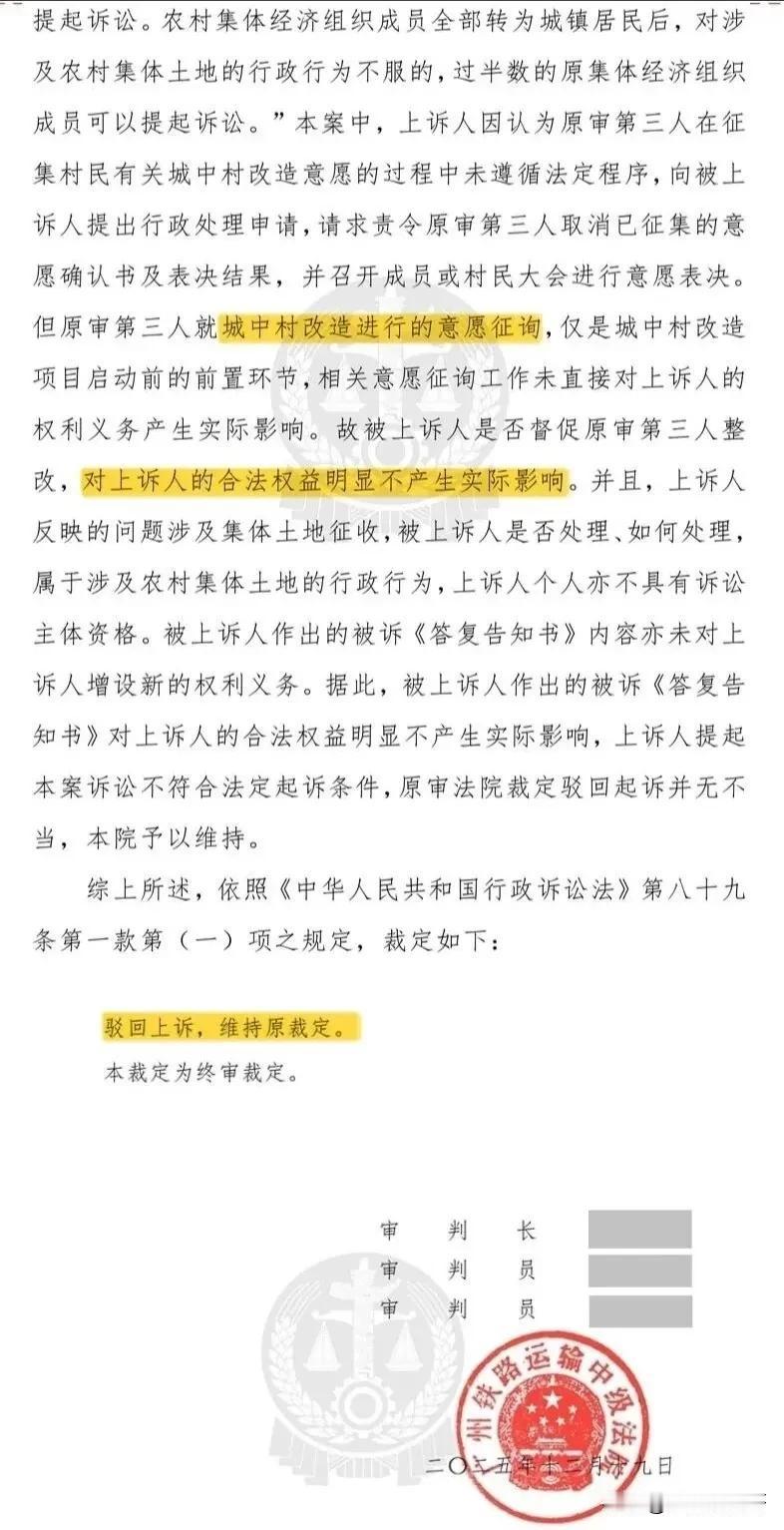 项目合法合规!所有起诉被驳回!白云区夏茅城中村改造行政诉讼结果新鲜出炉 村民反映的比如改造意愿征询不成立等问题,裁定书都作出了具体表述。 对于违法征地问题、围蔽、拆除违法问题、民主决策程序违法问题的起诉,裁定书也都依据相关条例一一驳回。 看来,夏茅城中村改造扫清了障碍后之后,有望进一步加快速度了!