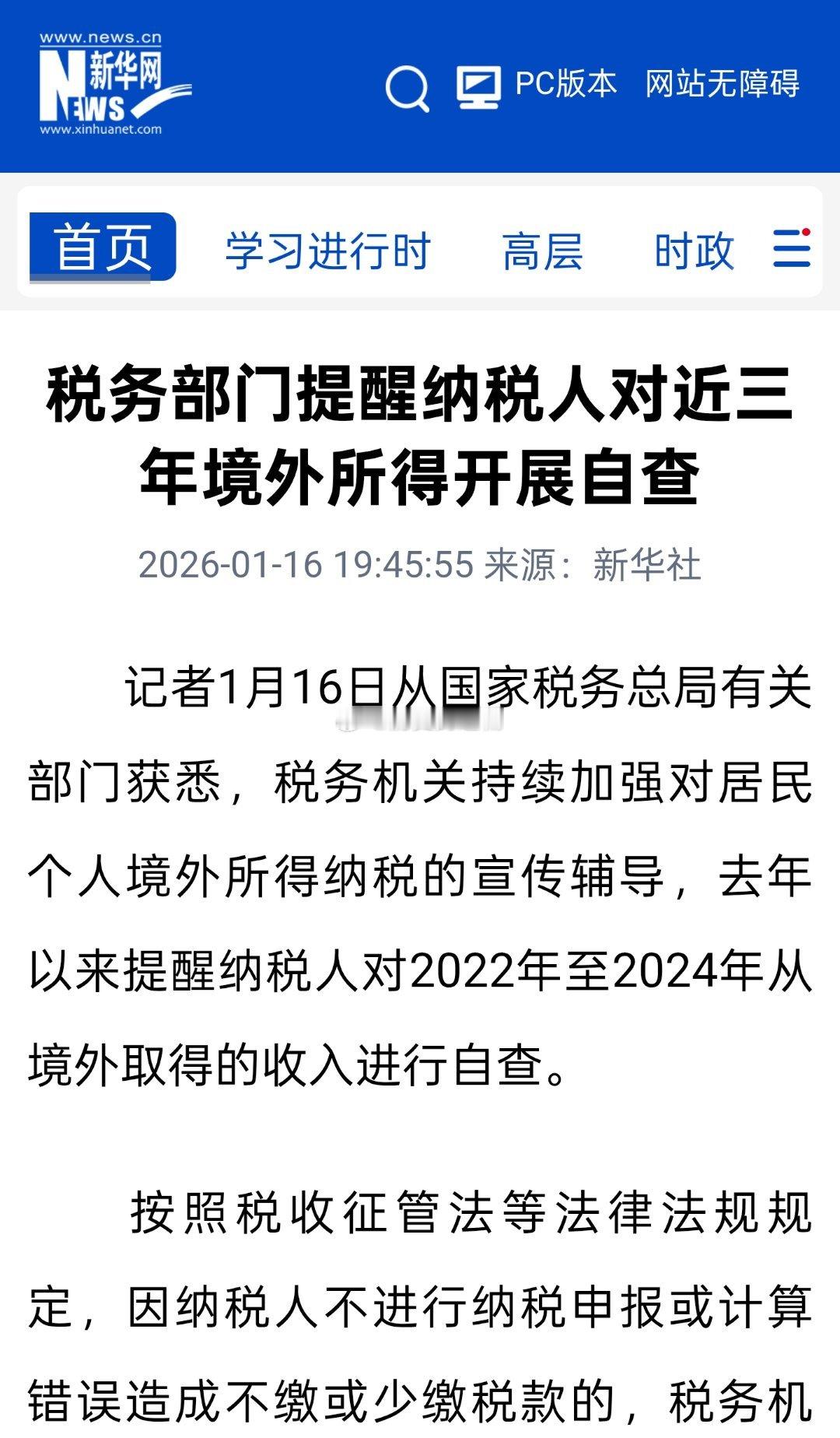 新华社:从国家税务总局有关部门获悉,税务机关持续加强对居民个人境外所得纳税的宣传辅导,去年以来提醒纳税人对2022年至2024年从境外取得的收入进行自查。按照税收征管法等法律法规规定,因纳税人不进行纳税申报或计算错误造成不缴或少缴税款的,税务机关在三年内可以追征税款、滞纳金;构成偷税的,依法进行处理。