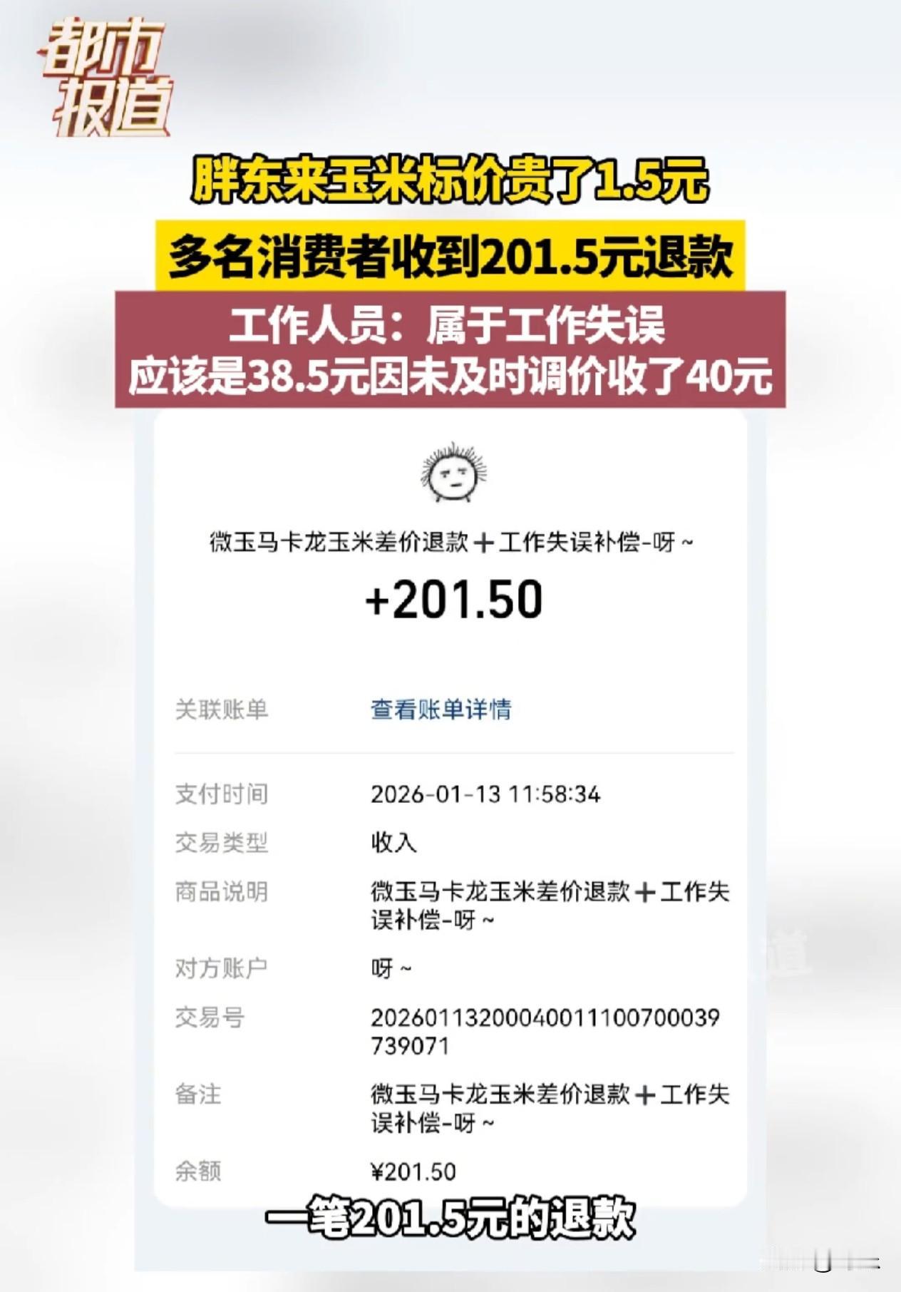 胖东来的这波操作又上热搜了! 近日,胖东来又因“宠粉操作”登上热搜!河南新乡多名消费者反映,自己此前在胖东来三胖店购买的一袋玉米,意外收到了201.5元的退款——这背后的原因,让无数网友直呼“这才是真正尊重消费者”。 据新浪财经、中华网等权威报道,这款玉米的原价应为38.5元,但因门店未及时调价,实际收取了40元,相当于多收了1.5元。发现工作失误后,胖东来没有选择“悄悄整改”,而是主动打电话联系每位购买顾客说明情况,不仅全额退还1.5元差价,还提供了200元补偿(消费者可选择购物卡或线上直接到账),整套操作干脆利落,毫无推诿。 其实,这早已不是胖东来第一次因“超额补偿”圈粉。就在去年12月,其新乡三胖店试营业期间,柚子标价错误导致每单多收4-5元,门店同样主动联系101位顾客,每人退还差价+200元补偿,总支出超2万元;2024年6月,联营餐饮擀面皮被曝卫生不达标,胖东来更是直接对8833名购买顾客全额退款,每人额外补偿1000元,总赔付金额达883.3万元。 对比行业常规操作,胖东来的做法堪称“降维打击”——多数商家遇到价格错误,往往只退还差价,或赠送小额优惠券、小礼品,像这样“1.5元失误赔200元”的操作,实属罕见。但正是这种“不计较短期成本,只在乎顾客感受”的坚持,让胖东来成为无数消费者心中的“良心标杆”。 有人说,胖东来的成功不可复制,因为它把“诚信”和“尊重”刻进了品牌基因里:不纠结于“1.5元算不算大事”,只在意“有没有让顾客受委屈”;不担心“补偿会亏多少钱”,更看重“能不能守住消费者的信任”。如今,越来越多品牌陷入价格战、流量战的内卷,而胖东来用实际行动证明:最动人的营销,从来都是“真诚”。 毕竟,消费者的信任从来不是靠低价堆砌,而是靠一次次“小事不敷衍”积累起来的。1.5元的差价或许微不足道,但200元的补偿背后,是商家对自身失误的严格问责,更是对消费者权益的极致尊重。 你怎么看待胖东来的“超额补偿”?你遇到过让你印象深刻的良心商家吗?欢迎在评论区分享你的经历~