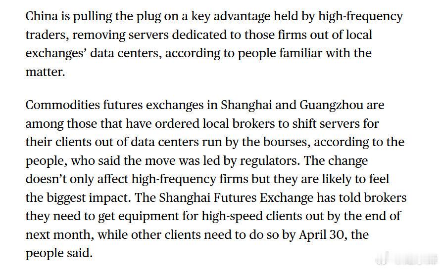要闻 彭博:中国监管机构正削弱高频交易者的一项关键优势,将专用于这些公司的服务器从本地交易所的数据中心移除。知情人士透露,上海和广州等地的商品期货交易所已要求当地经纪商将其客户的服务器从交易所运营的数据中心迁出。高频交易公司受到的影响可能最大。其他在华展业的国际机构,包括Citadel…