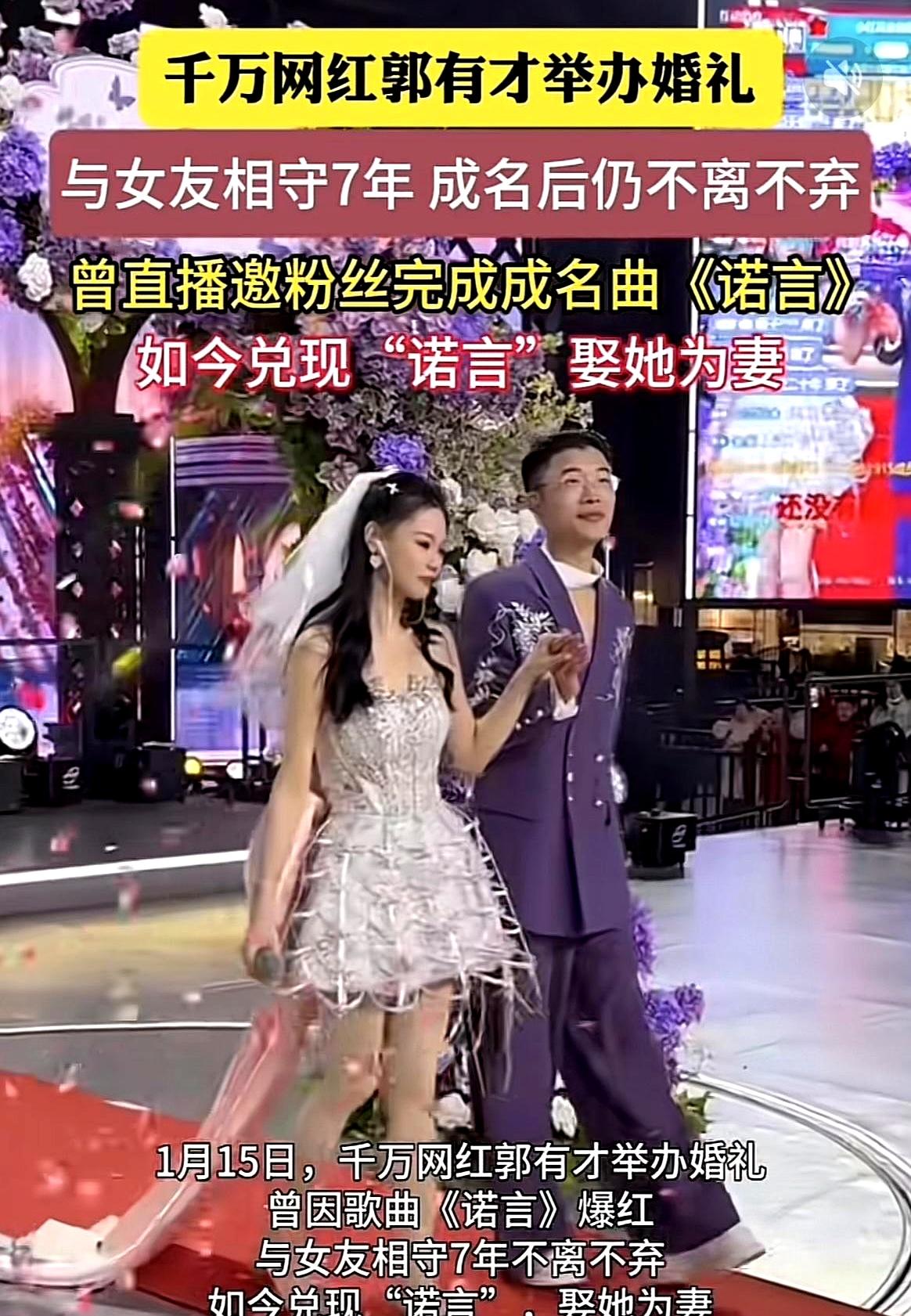 郭有才结婚,选在老家菏泽办中式婚礼。 2026年1月15日订婚,16日拜堂。 七年爱情没画饼。 2019年,他还在路边烤串,苏畅递水收钱。 2024年5月,一首《诺言》把他推到1700万粉。 求婚那天,他掏房产证当戒指,丈母娘直接退彩礼。 婚礼不收礼,只发糖和家电三件套,说宠粉。 有人感动,有人翻旧账:这感情真不真? 草根逆袭加真爱,故事好听。 可流量越大,放大镜越亮。 别只盯着糖,也看看人。